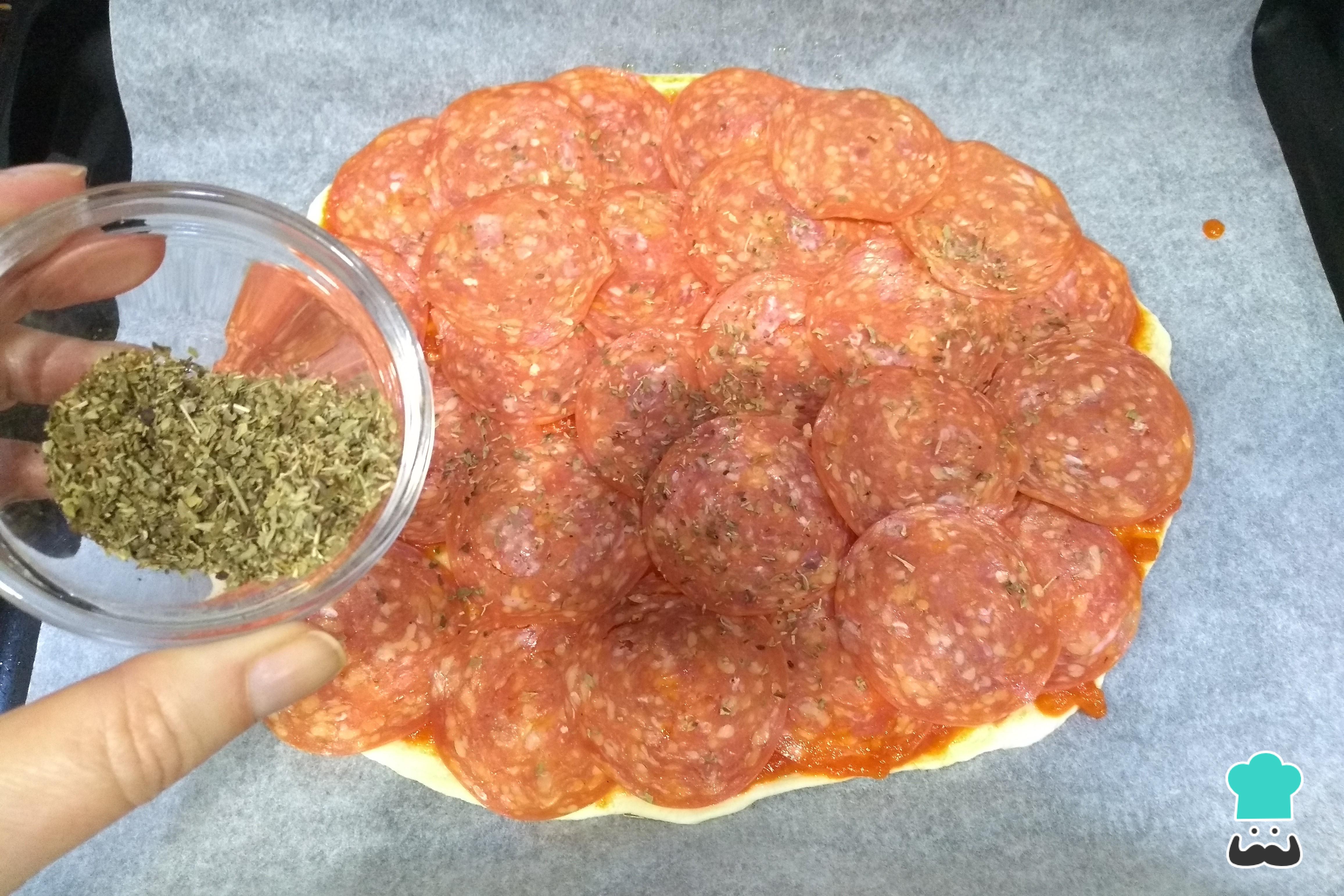 Continue colocando os ingredientes da cobertura da sua pizza caseira: agora espalhe as fatias de pepperoni e, depois, polvilhe os oréganos.