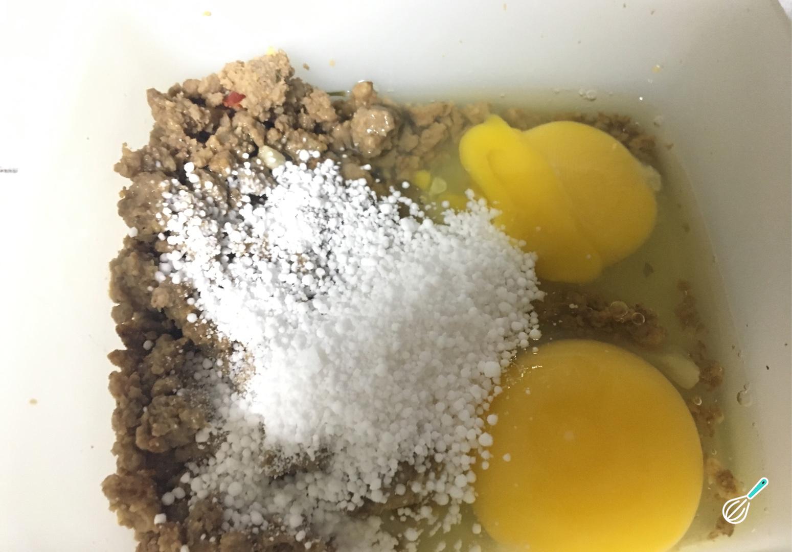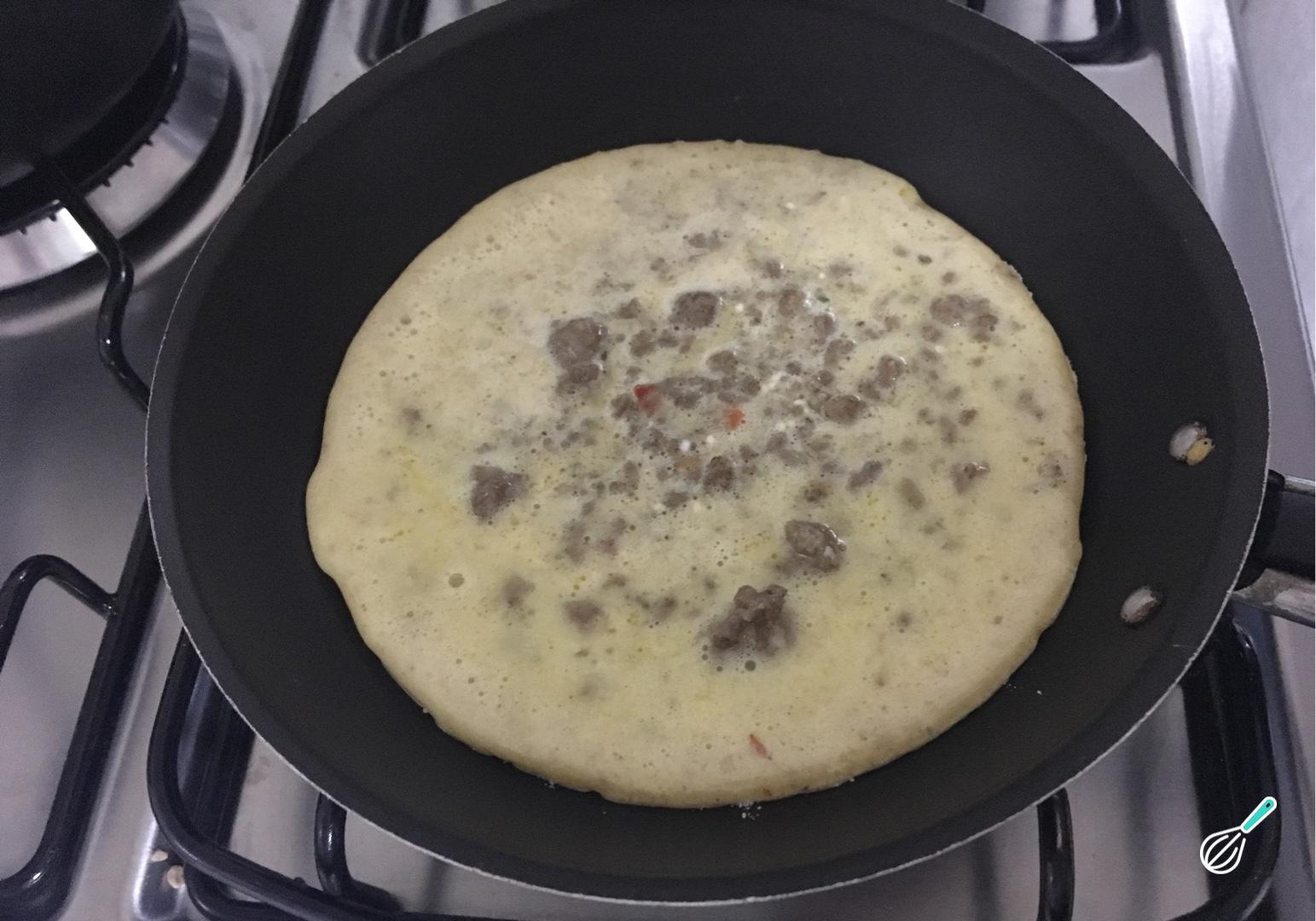 Em um recipiente junte os ovos, a tapioca, a carne e sal a gosto. Bata com o garfo.