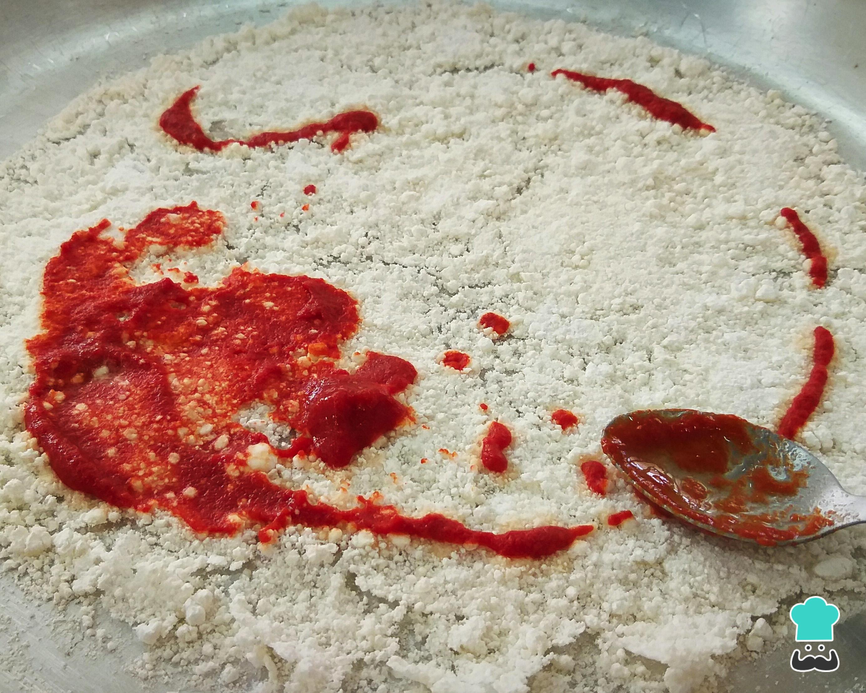 Desligue o fogo, aguarde a massa esfriar e cubra com molho de tomate. Se você preferir pode preparar seu próprio molho de tomate para pizza.