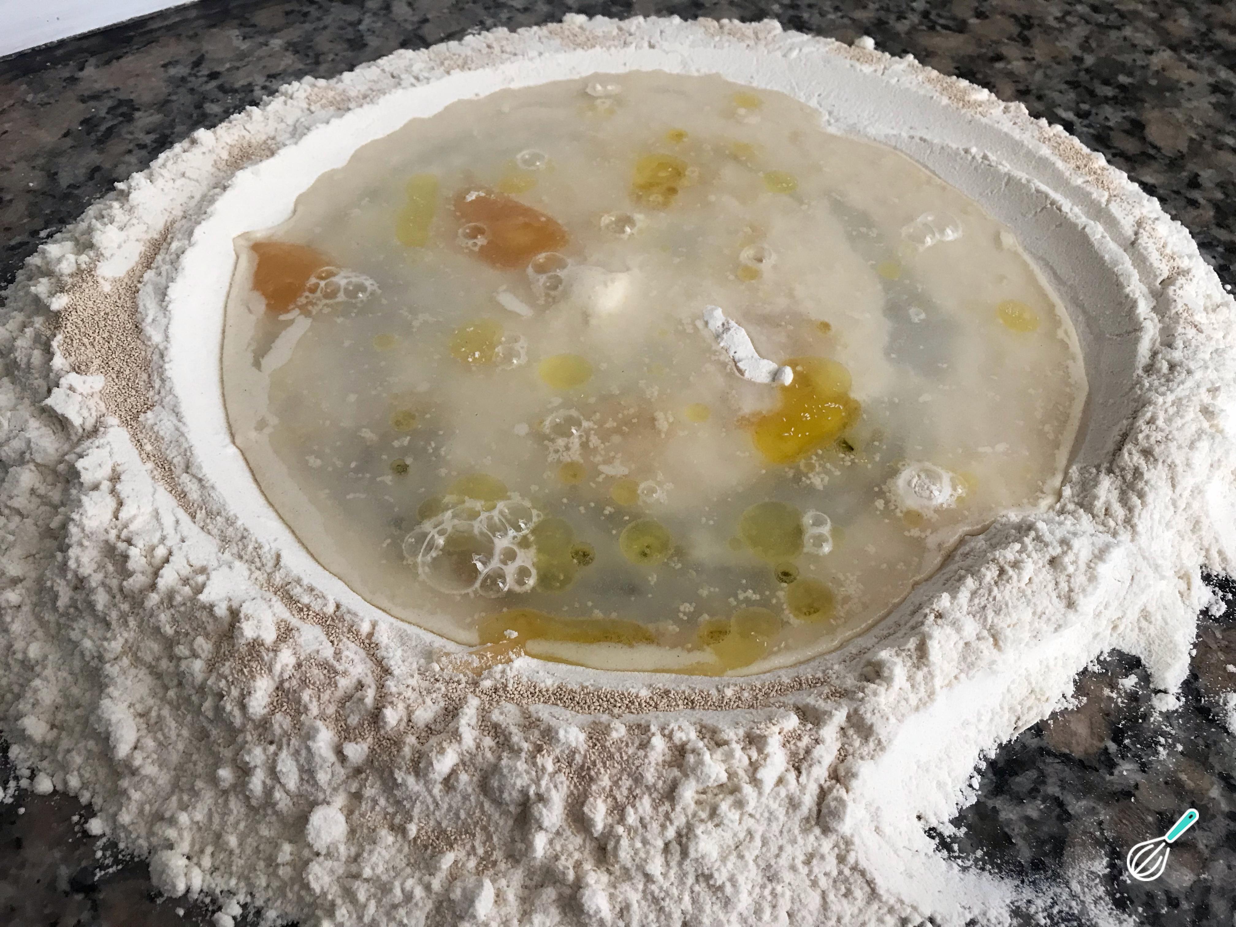 Para preparar uma deliciosa Pizza na churrasqueira, faça uma coroa com a farinha na mesa limpa. No centro, coloque o fermento, a água morna e o mel. Comece a incorporar os ingredientes do centro para fora e amasse por cerca de 5 minutos.