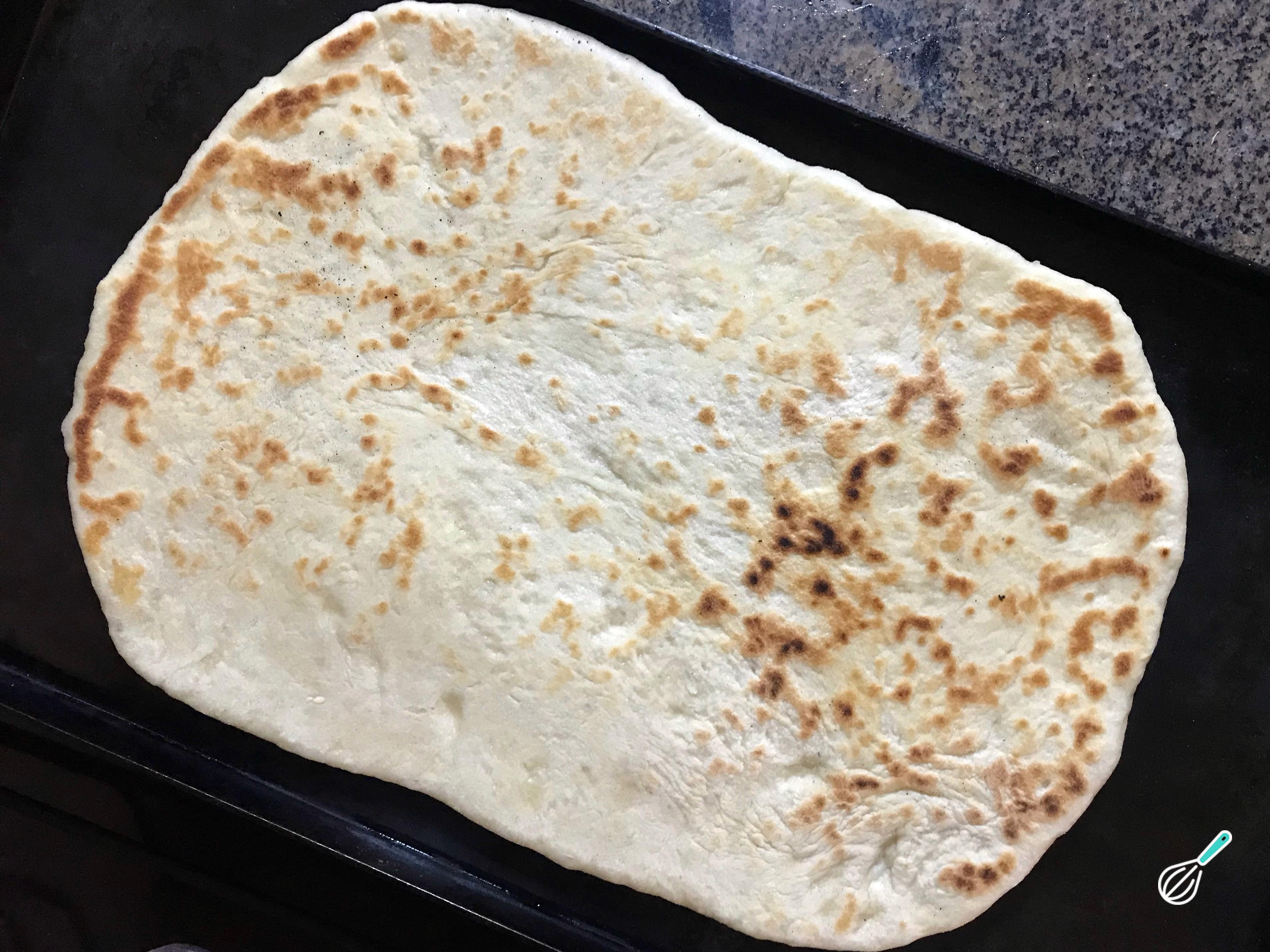 Unte uma frigideira ou grelha com azeite e, em fogo alto, coloque a massa da pizza para assar na grelha. Mova as brasas para os lados para que a massa não queime ou abaixe o fogo para médio se estiver usando uma chapa. Assim que a massa estiver envolvida, como se vê na imagem, vire-a.