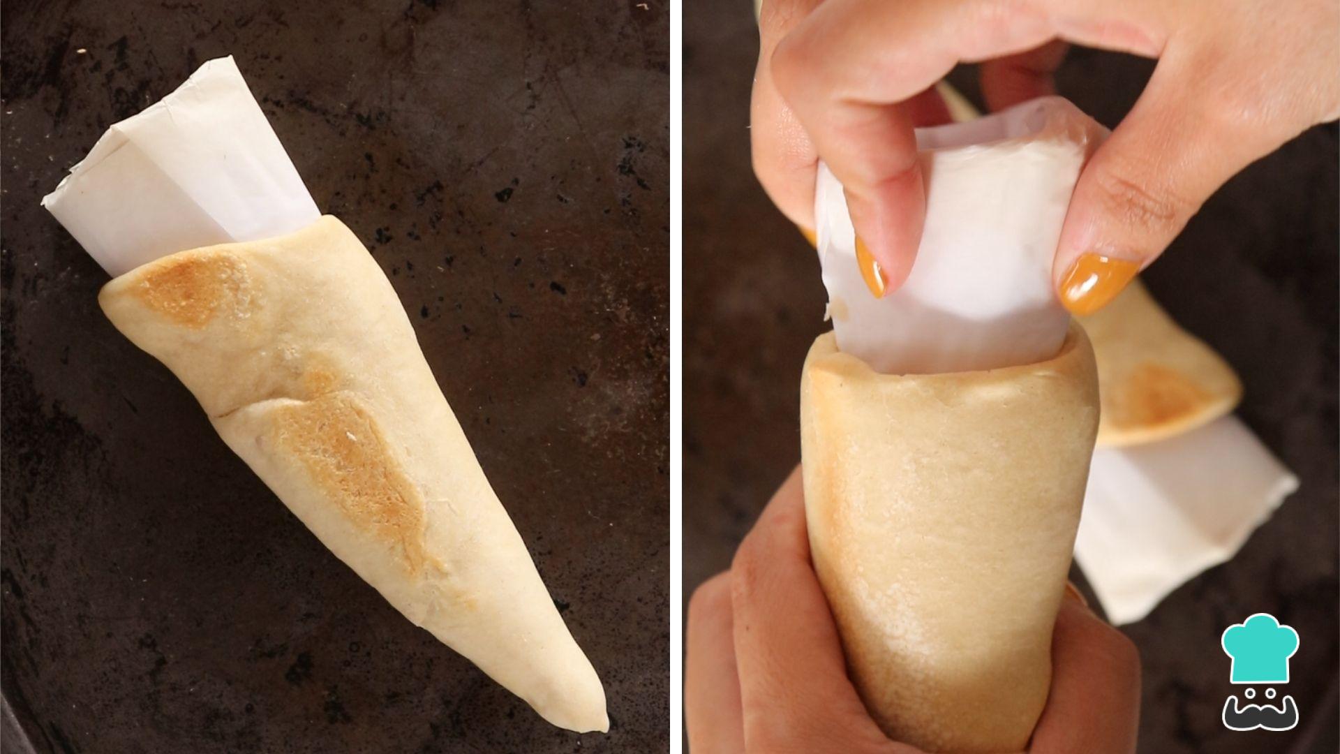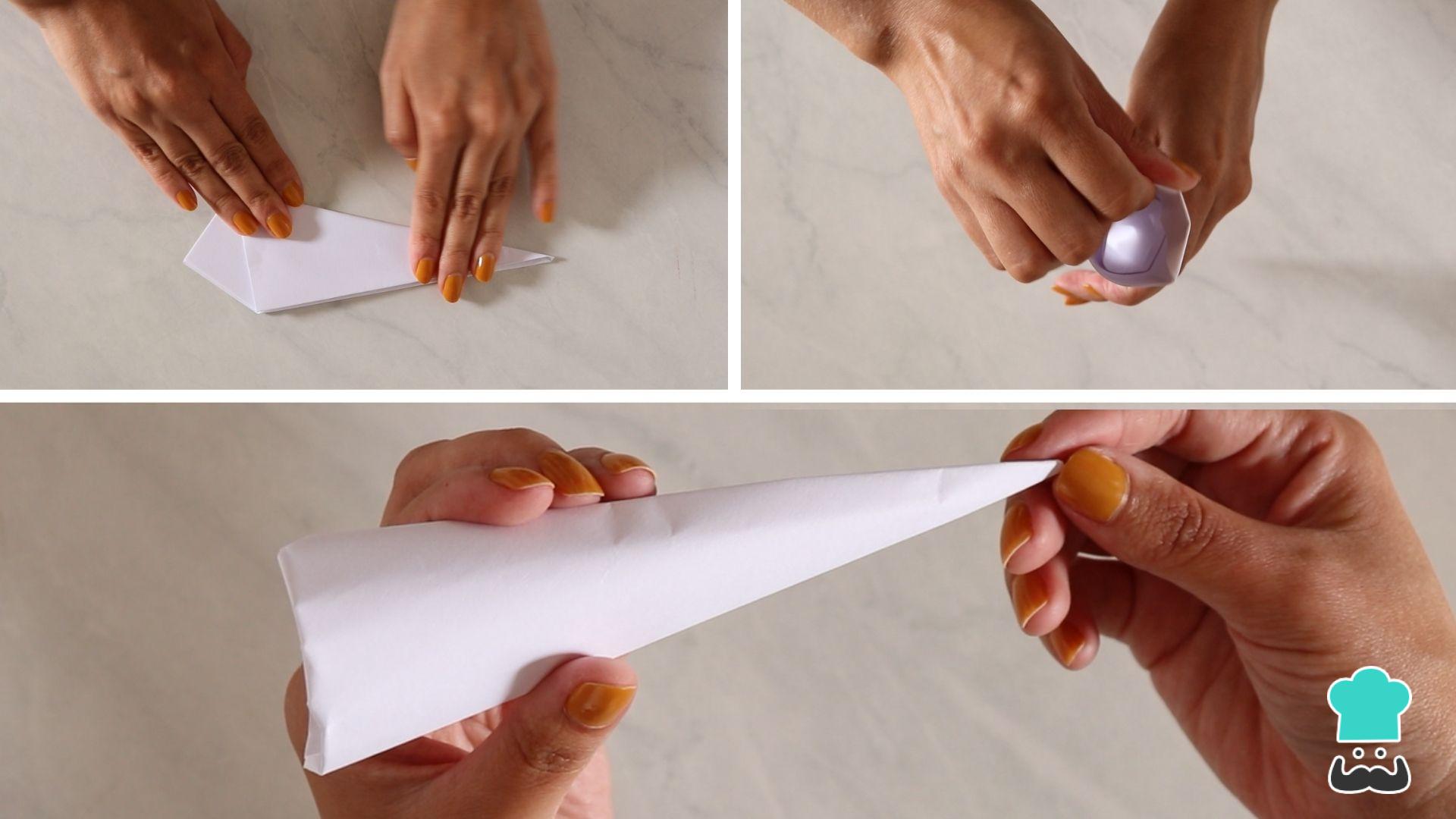 Termine de dobrar, embrulhe o cone que se formou com papel manteiga e prenda na parte superior para o papel não escapar.