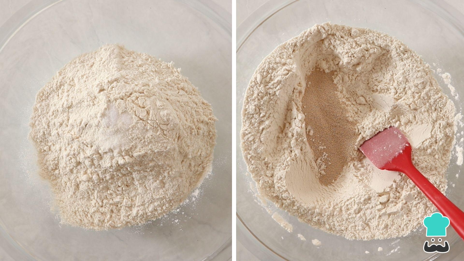 Em uma tigela grande misture a farinha, o açúcar e o sal. Em seguida junte o fermento biológico e misture mais uma vez.
