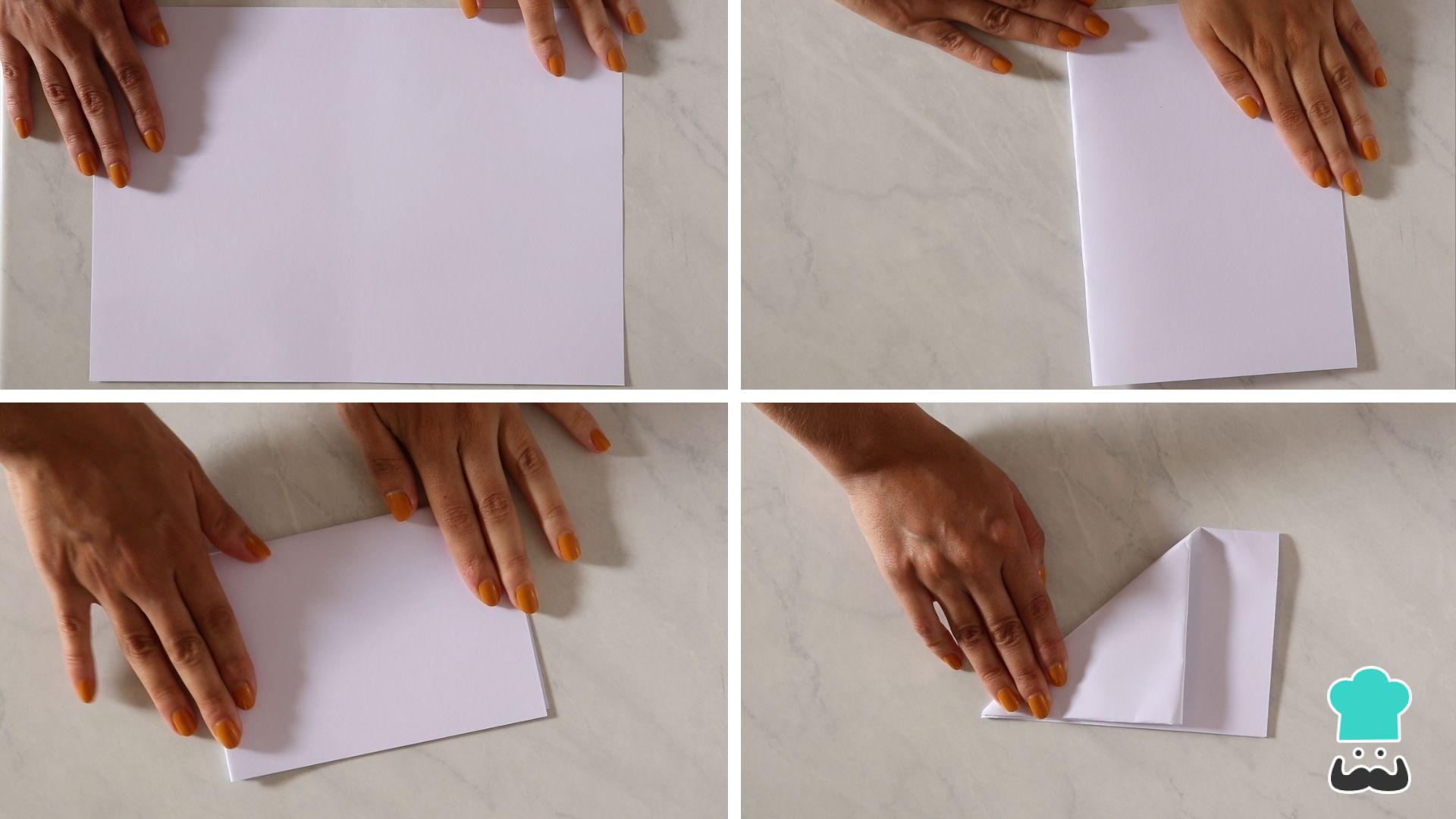 Enquanto isso, vamos fazer os os moldes que vamos usar para fazer essa pizza no cone. Pegue uma folha de papel sulfite e dobre até formar um cone, como na imagem abaixo: