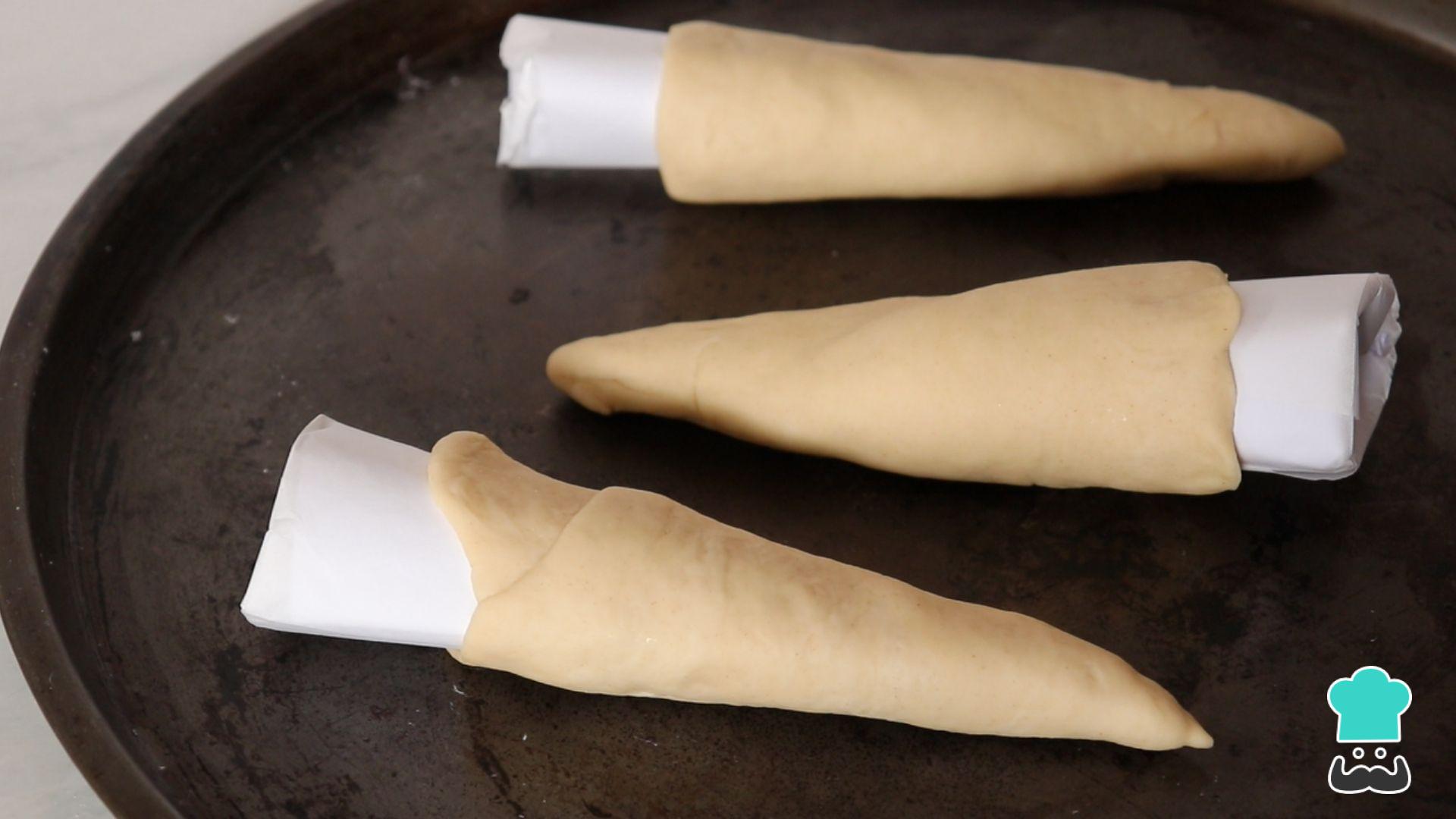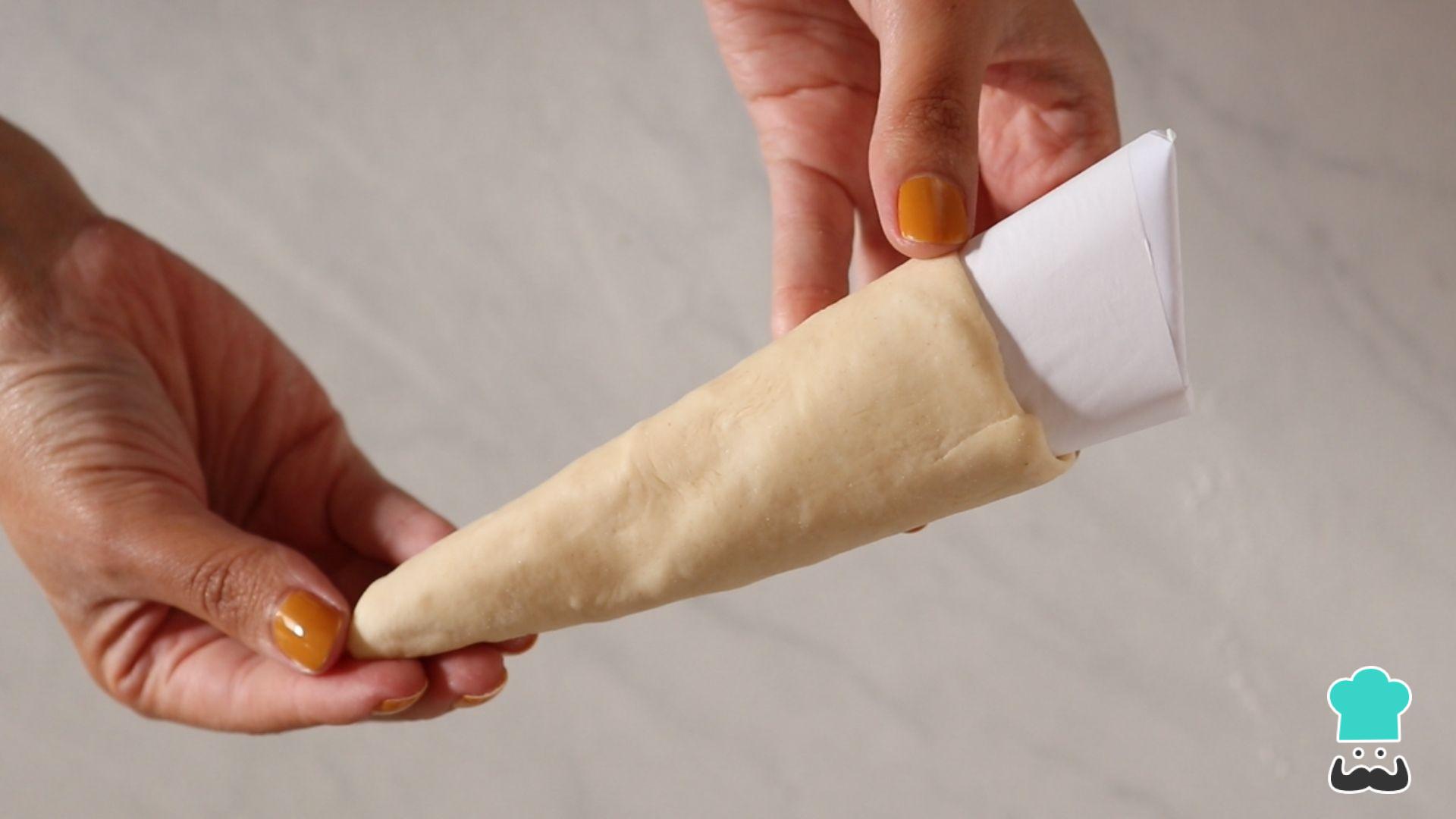 Divida a massa em pequenas porções, abra com um rolo e enrole a massa no cone, fechando bem a ponta