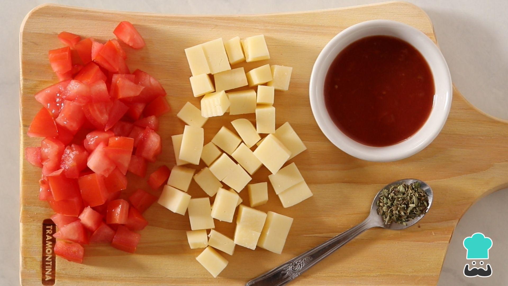 Enquanto a massa assa, prepare o recheio da sua pizza no cone caseira, aqui vamos fazer um bem básico com queijo e tomate.