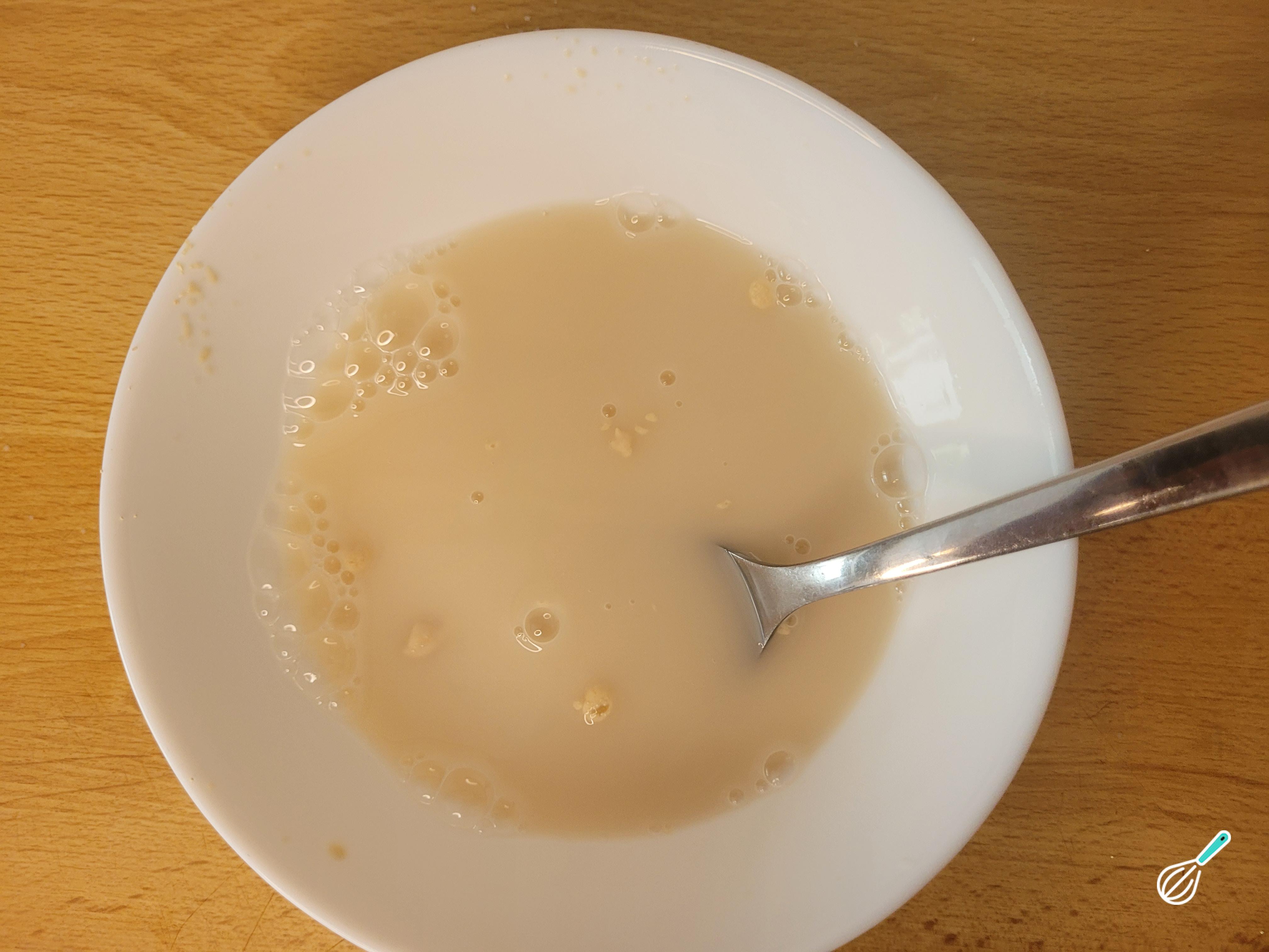 Em uma tigela, misture o fermento com a água e mexa bem para dissolver. Observe a formação de bolhas, que indica que o fermento está ativo. Caso não observe a formação de bolhas, descarte e comece novamente, pois pode indicar que o fermento perdeu a força e irá prejudicar a fermentação.