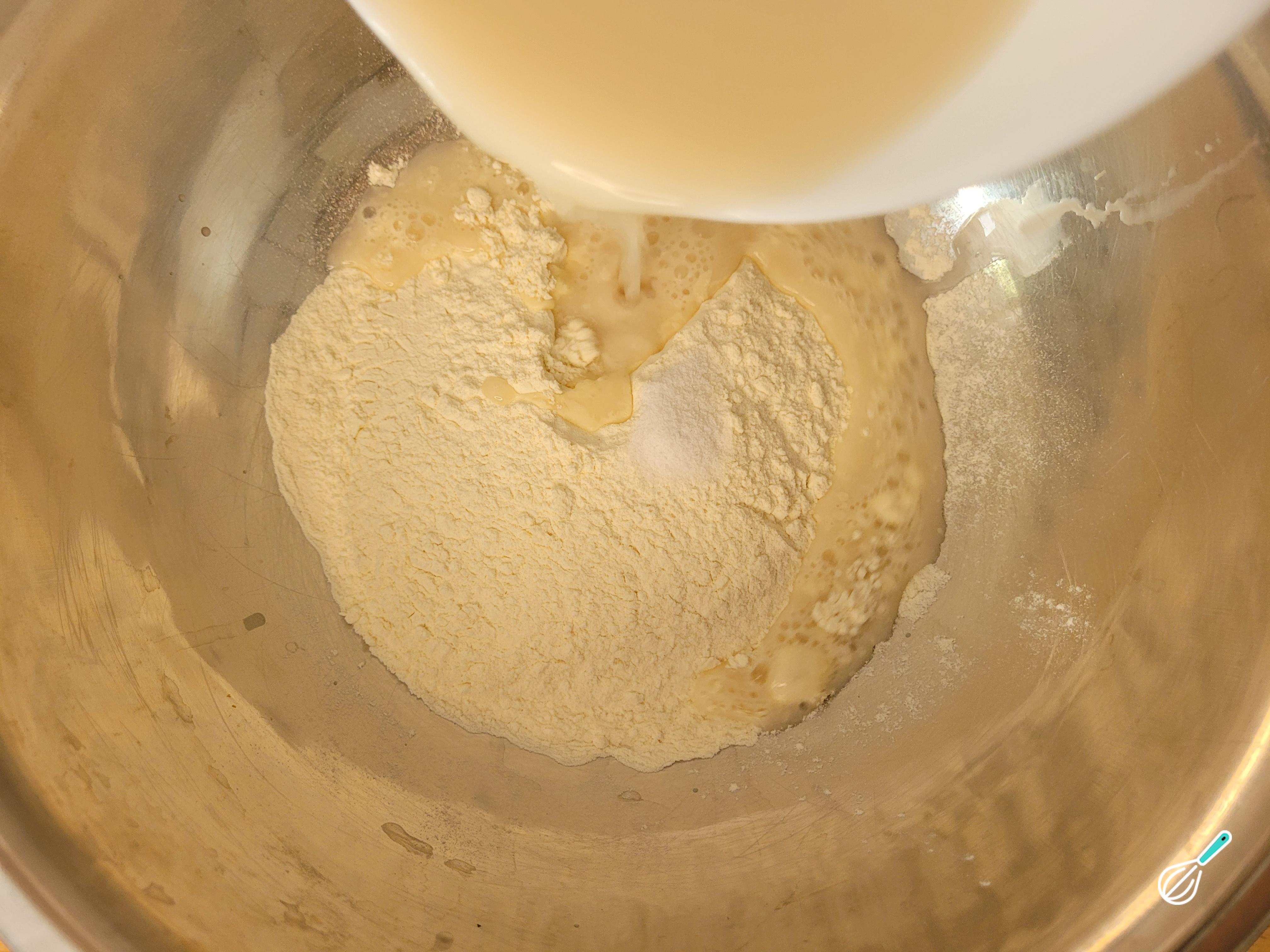 Abra um buraco na massa e adicione a mistura de fermento e o azeite.