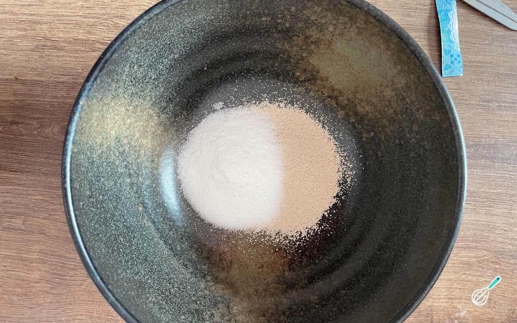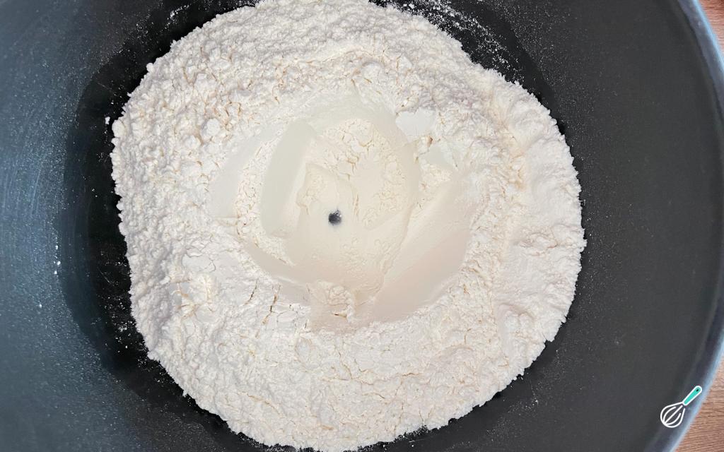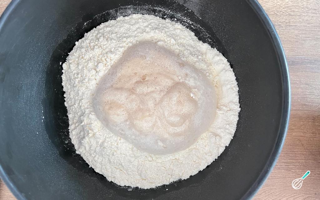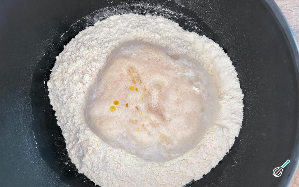 Na tigela da batedeira, misture a farinha e o sal e faça um buraco no meio.