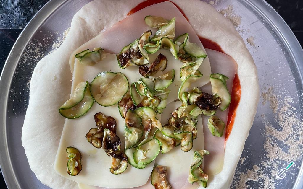 Retire a massa do forno, espalhe o molho, coloque o recheio da sua preferencia, aqui colocamos mussarela e abobrinhas grelhadas. Volte a pizza para o forno por mais 15 minutos para terminar de assar e dourar – se o seu forno tiver grill, ligue-o para garantir uma cor mais bonita.