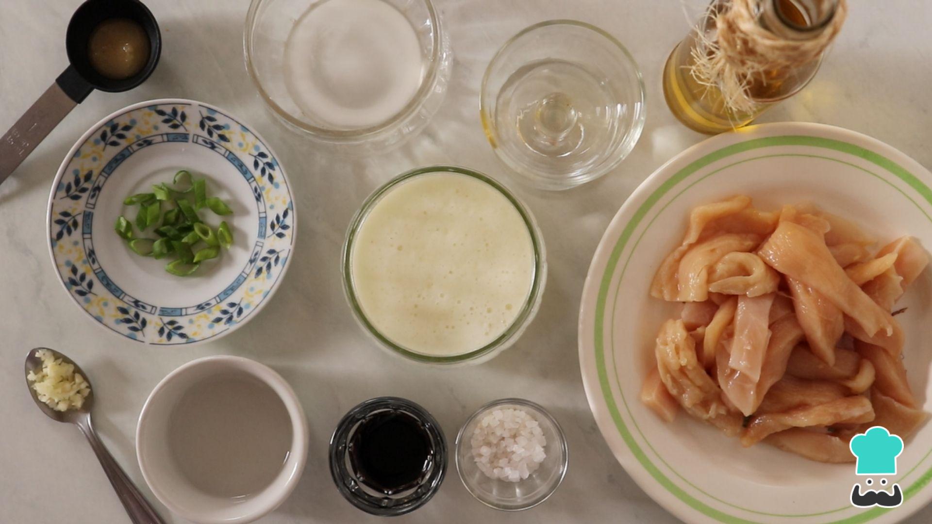 Separe os ingredientes. Corte o frango em tiras, pique o alho e a cebolinha e dissolva o amido de milho em um pouco de água.