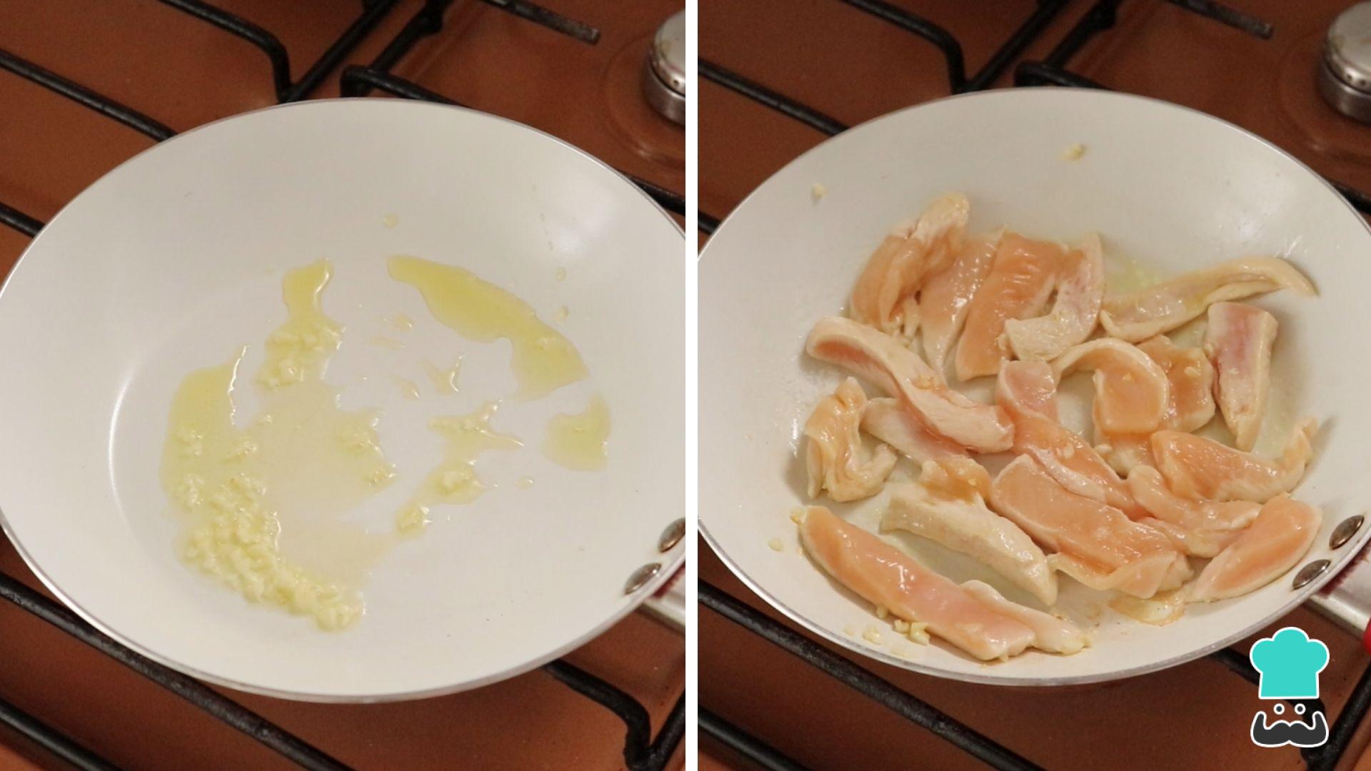 Leve uma panela ao fogo médio, coloque o azeite e refogue o alho. Acrescente o frango, tempere com sal a gosto e misture bem para pegar o sabor do alho.
