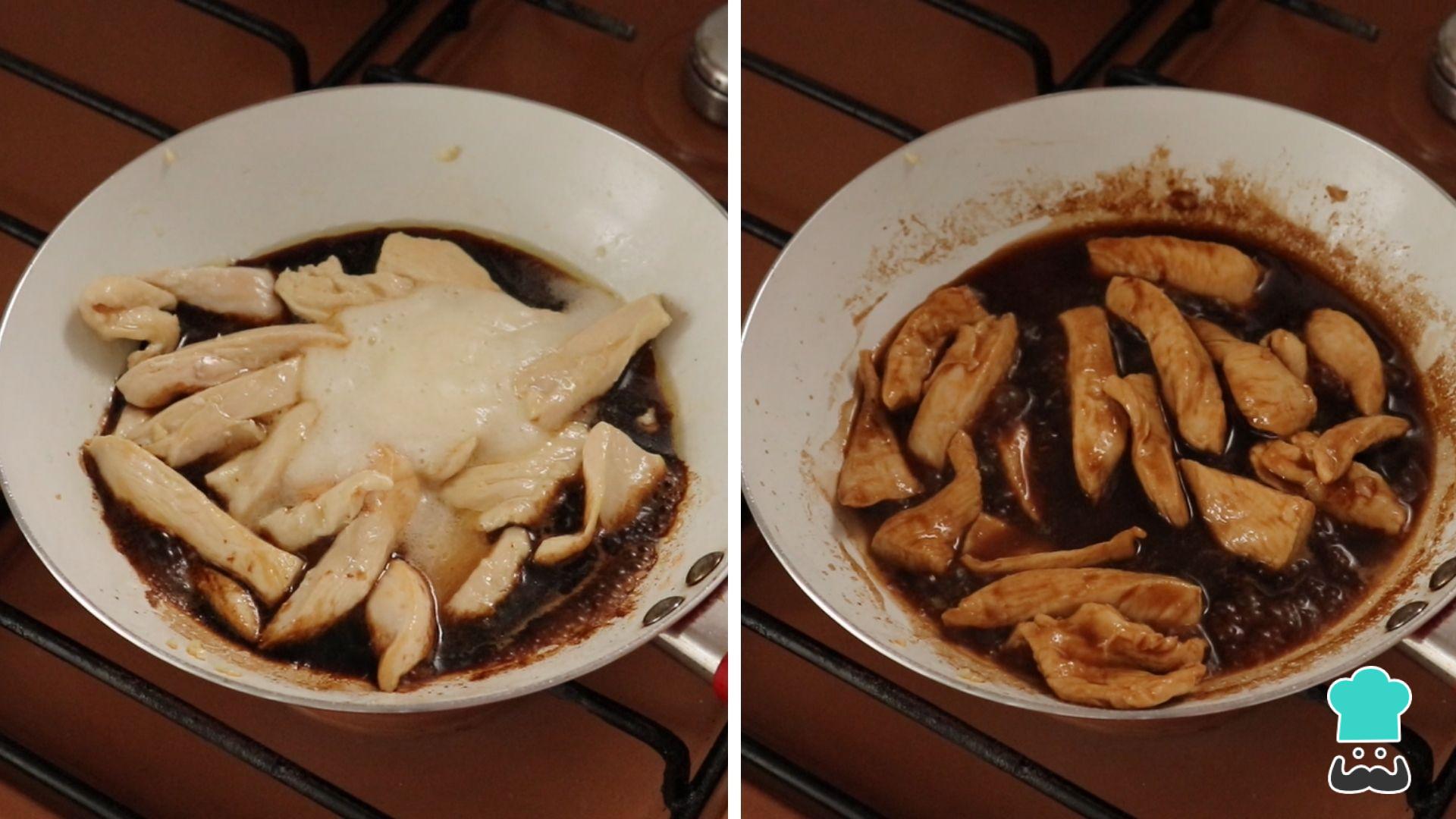 Assim que ferver, adicione o amido de milho dissolvido em água e mexa bem. Cozinhe até que o molho fique espesso. Adicione o mel e misture mais uma vez.