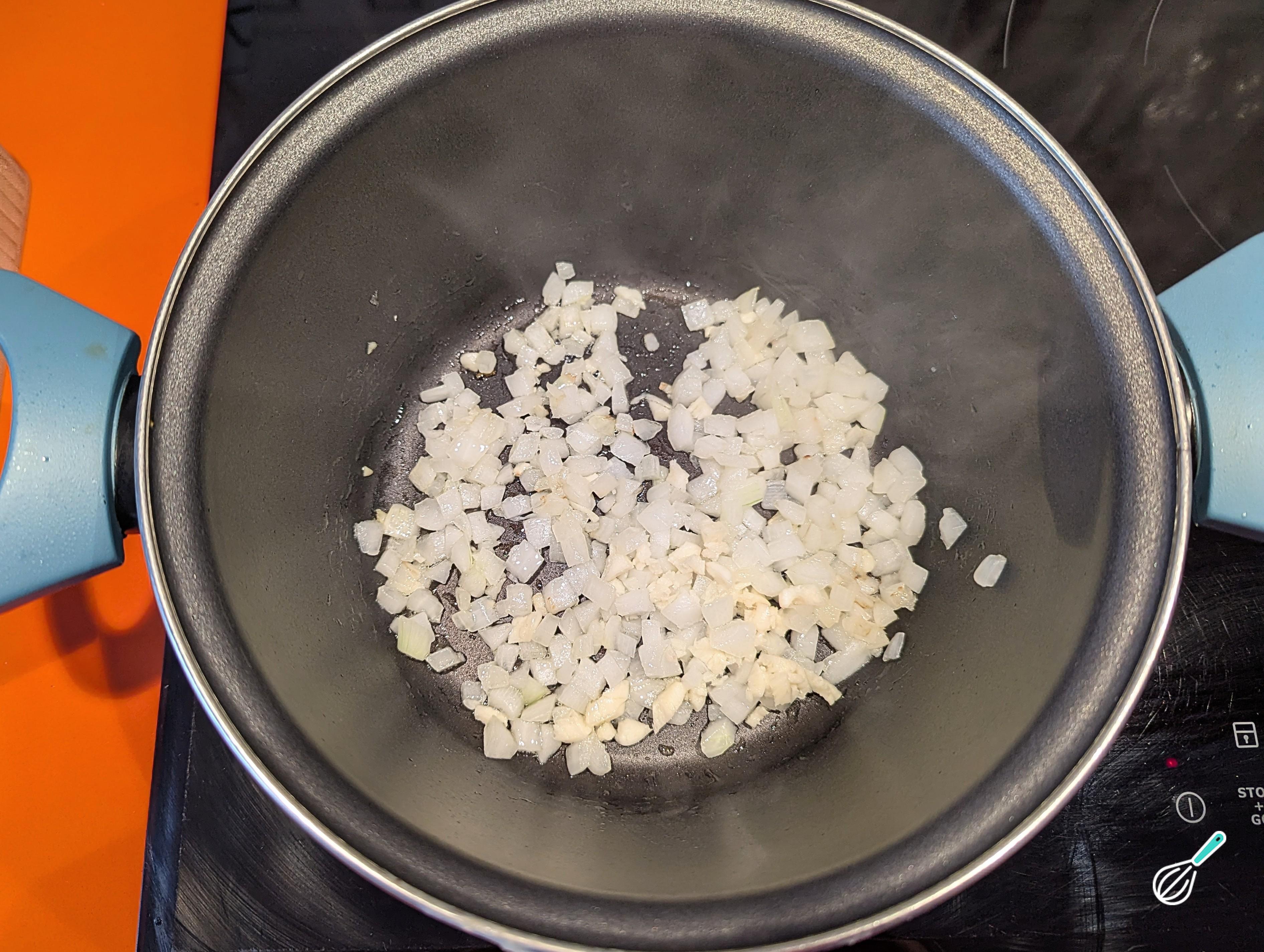 Em uma panela média, aqueça o azeite e refogue a cebola até ficar transparente. Acrescente o alho e deixe fritar por alguns segundos até dourar.
