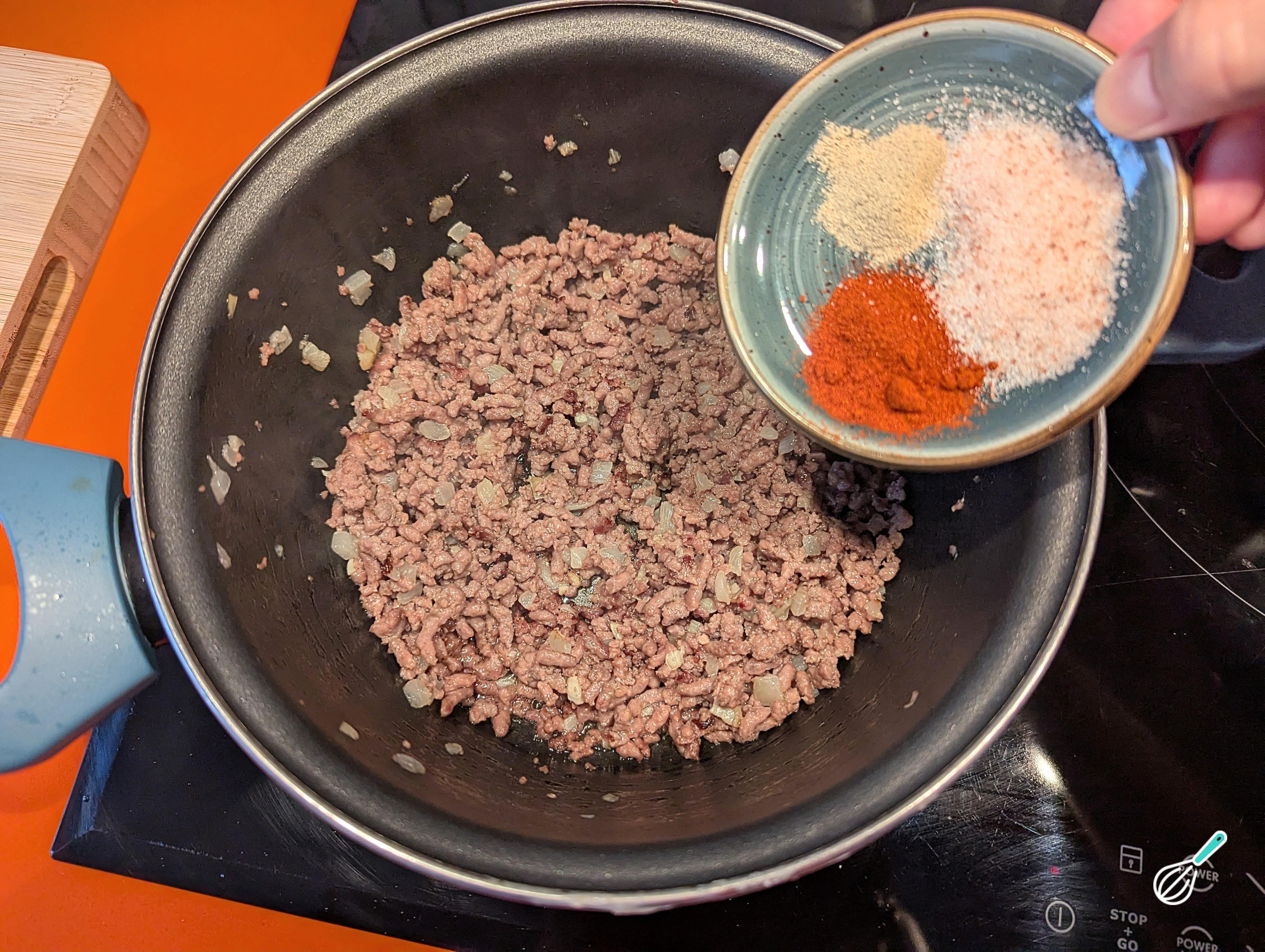Adicione a carne moída e mexa bem. Deixe cozinhar até perder a cor crua, ficando levemente dourada e soltinha.