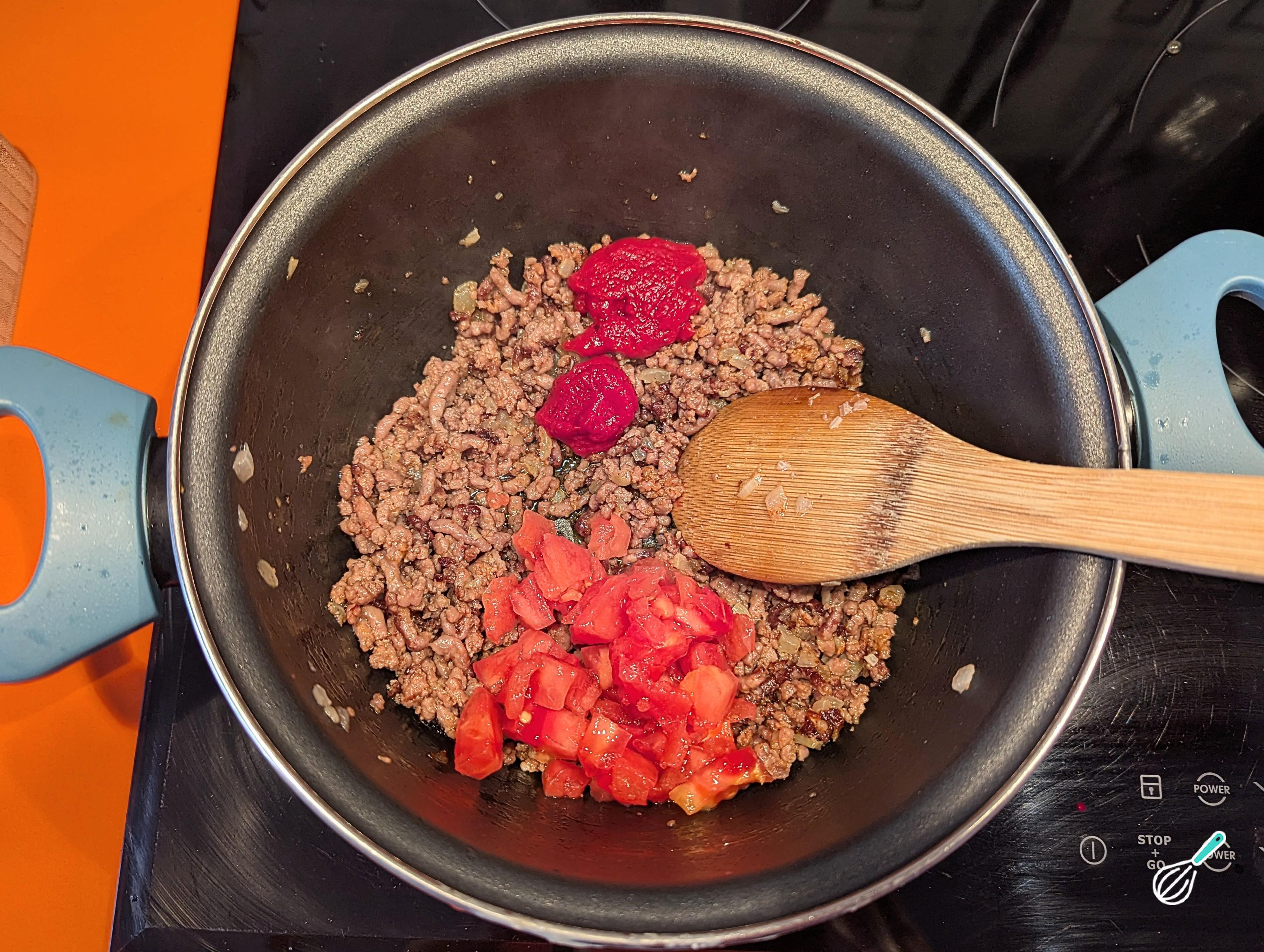 Acrescente o tomate picado e o extrato de tomate. Adicione também um pouco de água para formar um molho, tampe a panela e cozinhe por uns 10 minutos, ou até derreter o tomate e o molho encorpar. Finalize com o cheiro-verde e reserve.