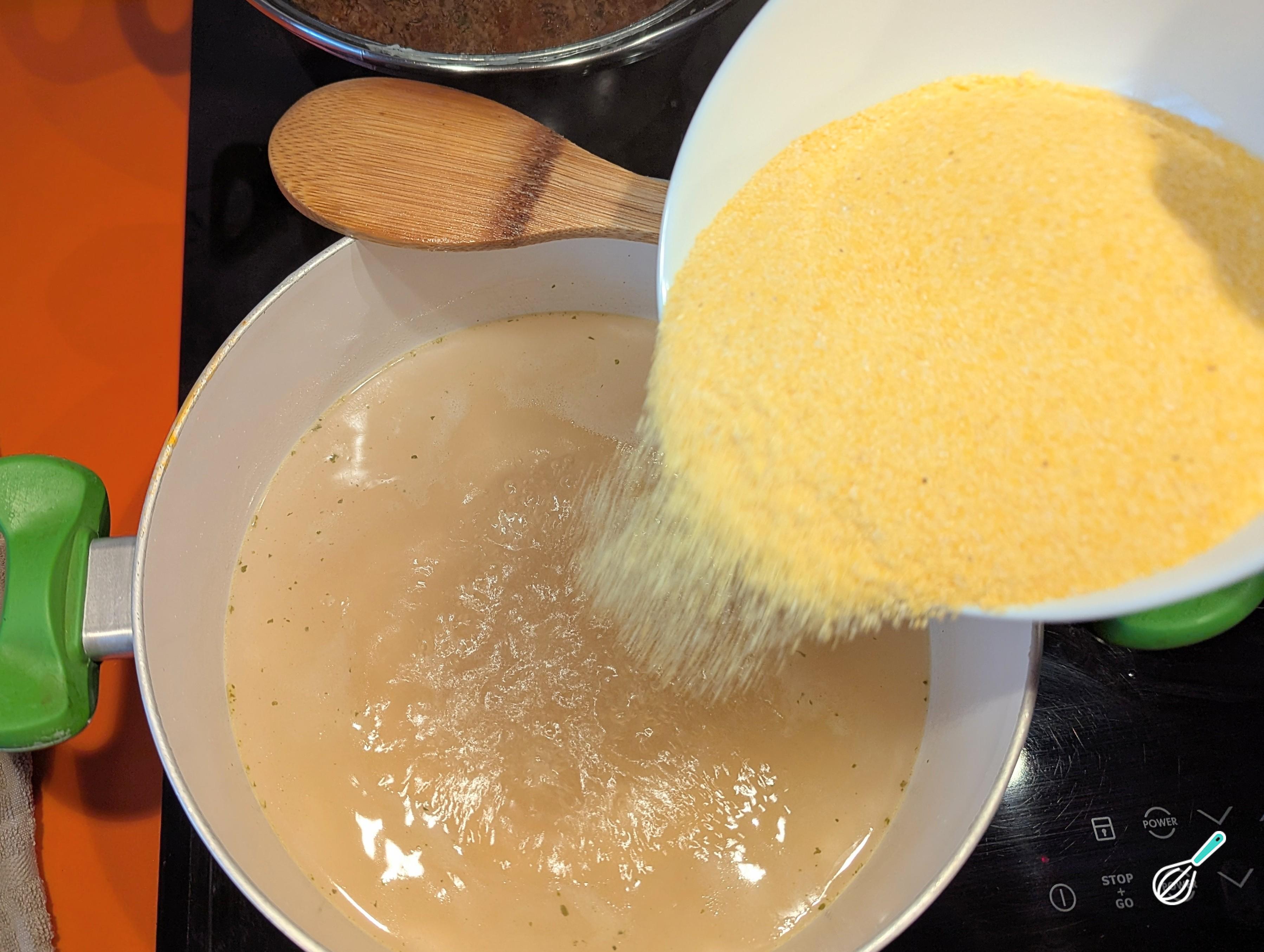 Em uma panela grande, adicione meio litro de água e meio litro de caldo. Quando levantar fervura, baixe o fogo e adicione aos poucos a farinha de milho, mexendo constantemente com uma colher de pau para evitar grumos. Isso leva em torno de 1 minuto, até a polenta engrossar e desgrudar do fundo da panela.