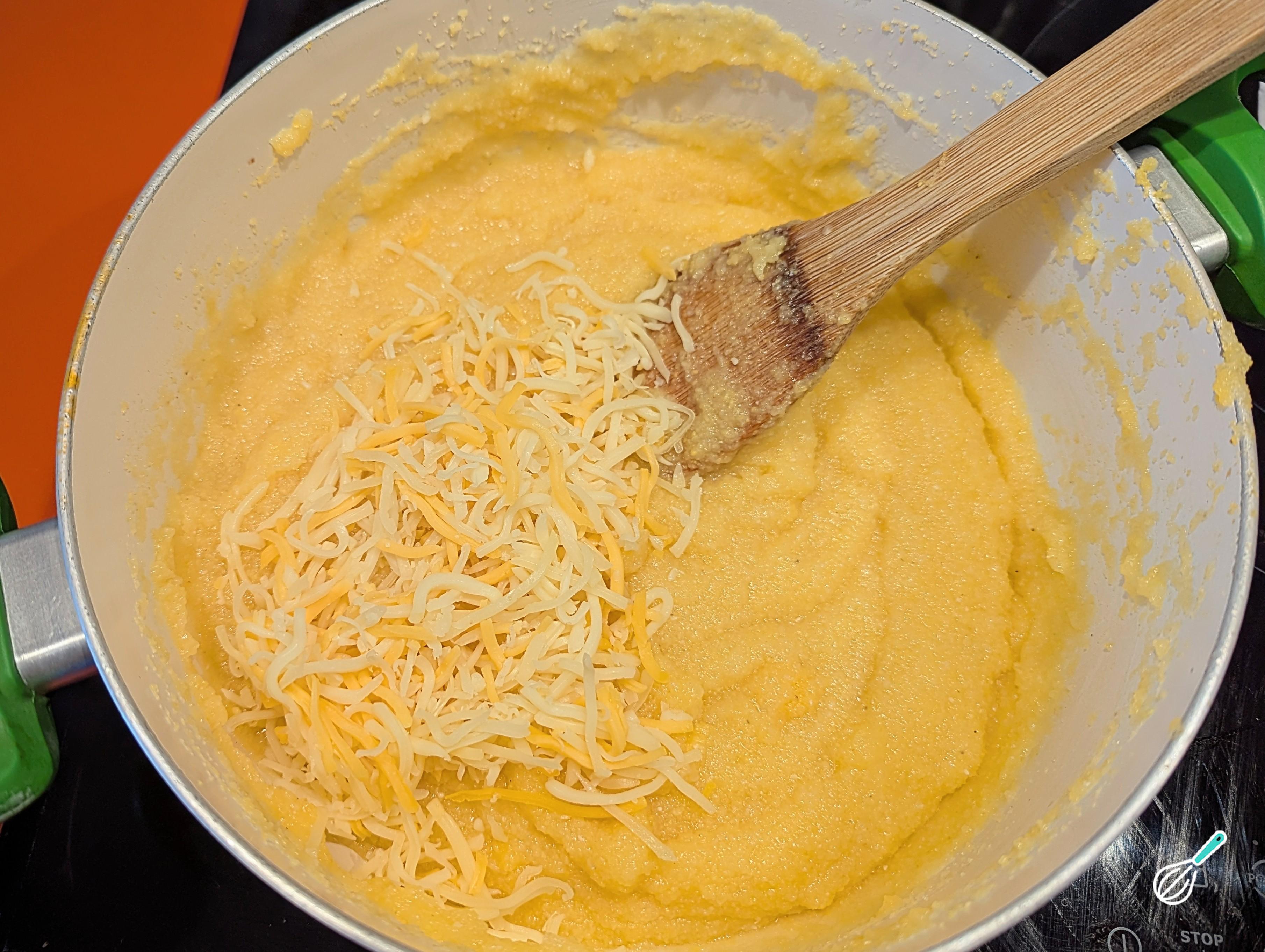 Desligue o fogo e adicione o queijo e uma colher de manteiga se estiver usando. Misture bem até que o queijo esteja completamente derretido. Ajuste o sal se achar necessário.