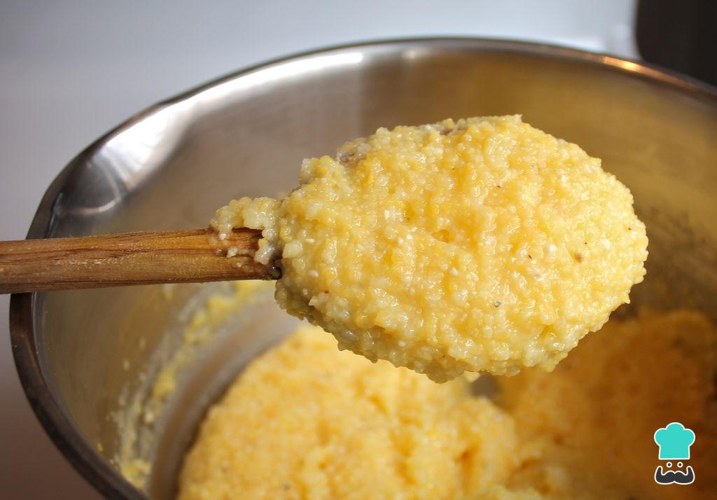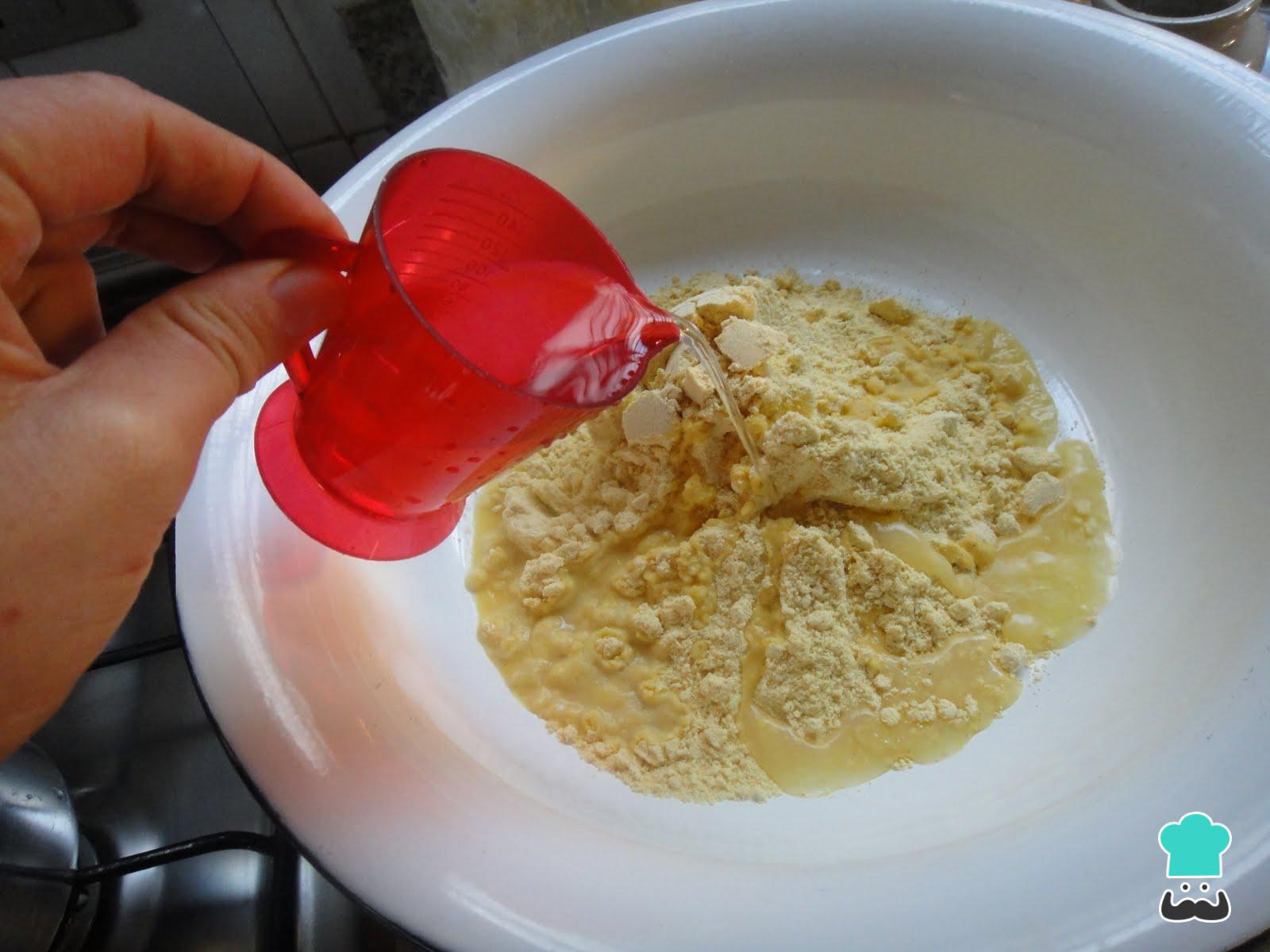 Para fazer polenta frita comece por hidratar o fubá em 1 xícara de água.