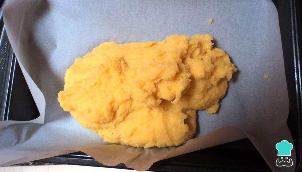 Transfira a polenta para uma assadeira grande (26 x 38 cm) umedecida e espalhe. Cubra com papel de alumínio e reserve na geladeira por algumas horas ou, de preferência, até ao dia seguinte.