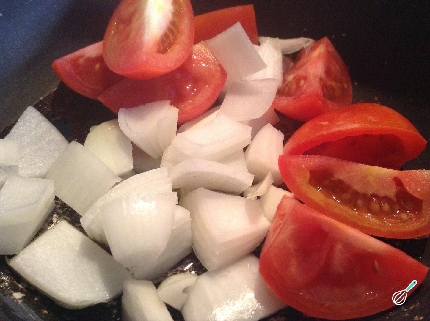 Leve uma panela funda ao fogo médio com um pouco de azeite de oliva. Adicione a cebola e os tomates cortados em pedaços para saltear um pouco.
