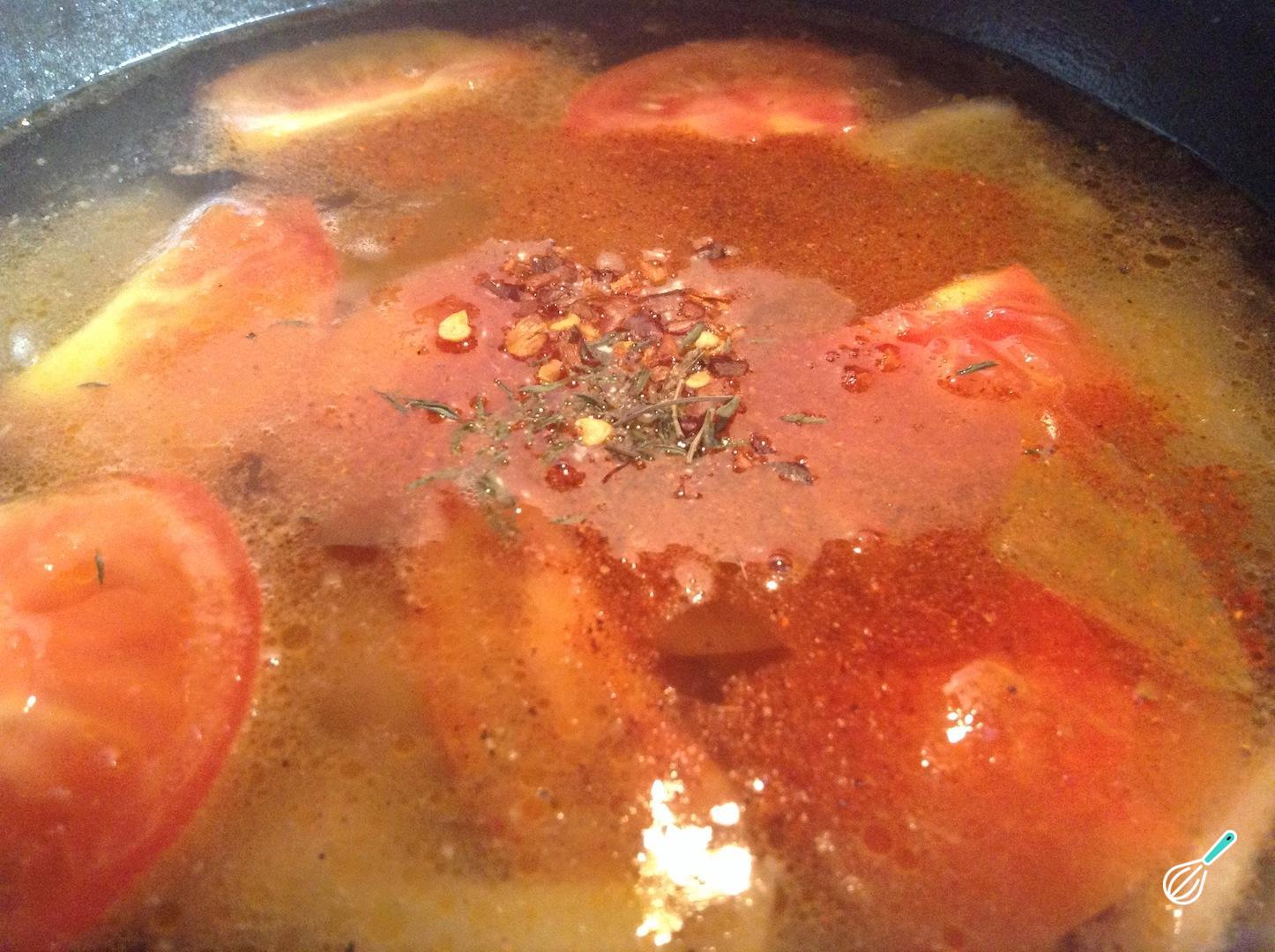 Assim que os vegetais estiverem bem salteados, adicione um pouco de água para cobri-los. Junte a pimenta calabresa e, se desejar, um pouco de tomilho seco. Cozinhe a base do molho por 20 minutos aproximadamente e remova do fogo.