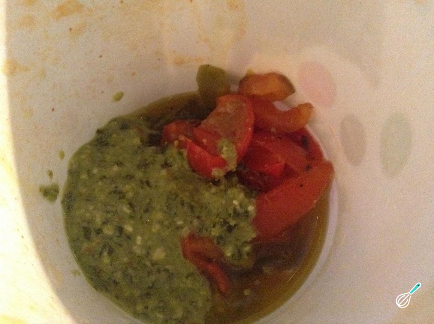 Coloque o molho de manjericão no liquidificador e bata com os pimentões assados.