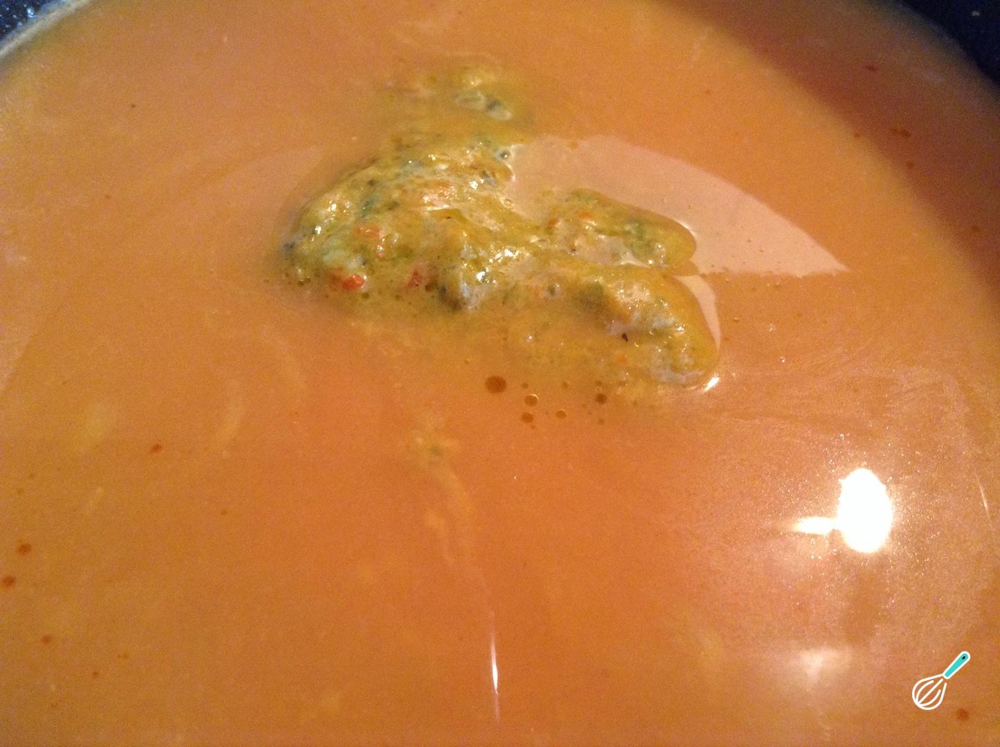 Adicione a mistura do passo anterior na panela do molho base e deixe cozinhar em fogo baixo por mais 5 minutos.