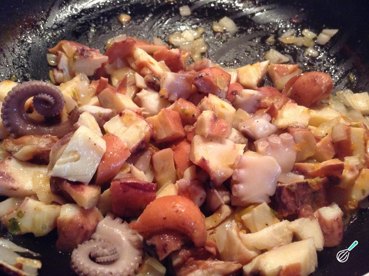 Salteie o polvo cozido picado com um pouco de azeite de oliva em uma frigideira bem quente e, em seguida, regue com o molho.