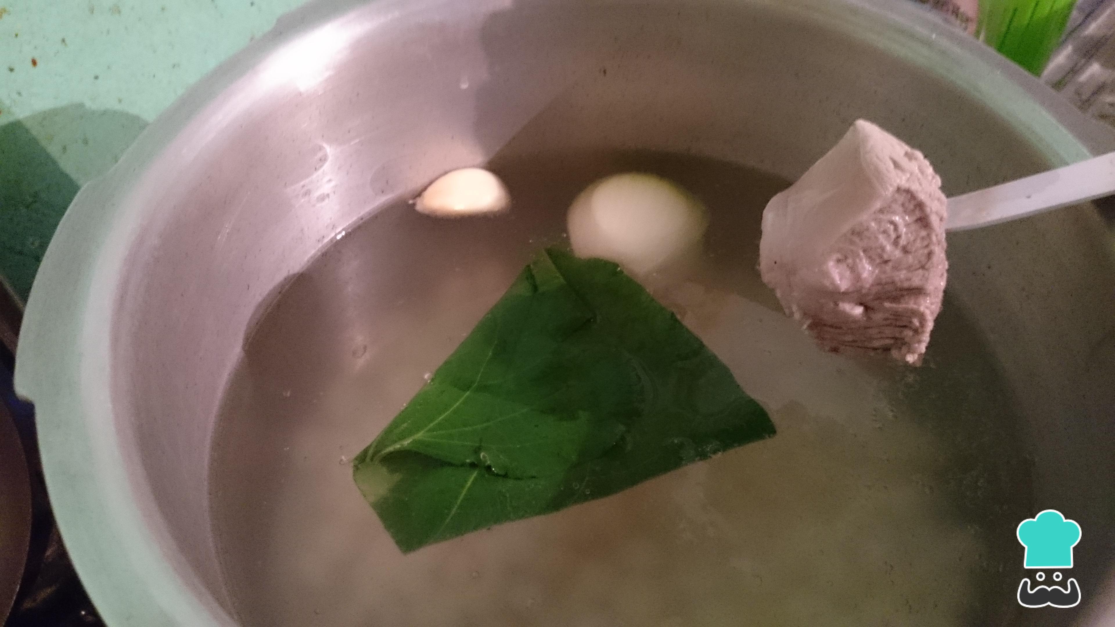 O passo seguinte da sopa pozole é colocar em uma panela de pressão a água, o milho, a carne, a hoja santa ou erva-de-santa-maria, a cebola, o dente de alho e sal. Tampe e cozinhe por 1 hora.