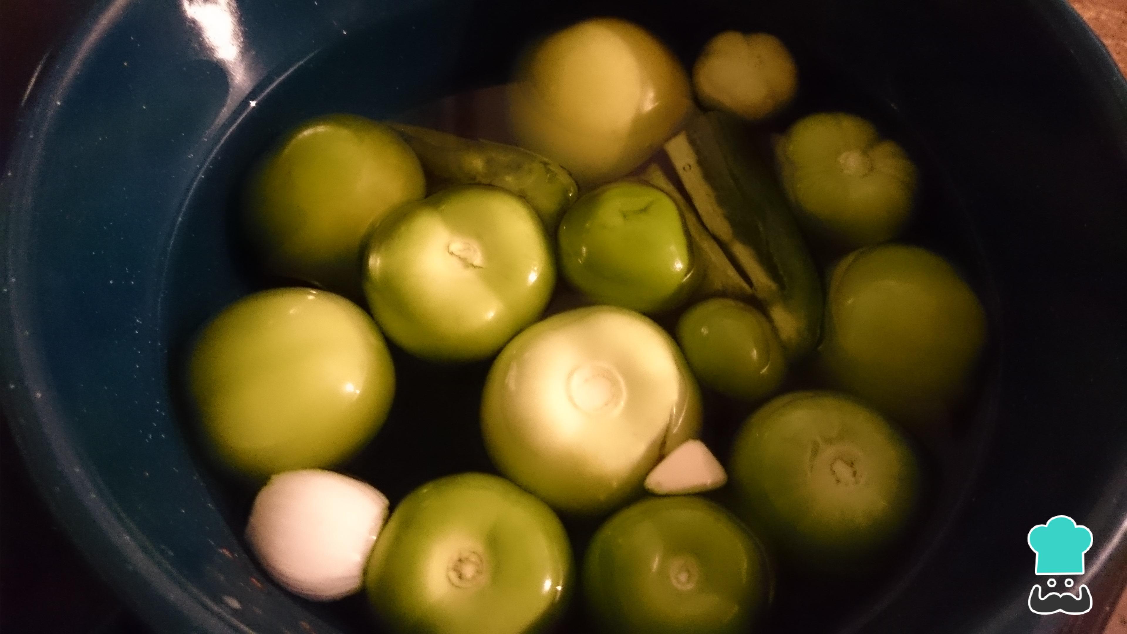 Enquanto a sopa cozinha, prepare o molho verde que lhe dará cor: coloque em uma panela com água os tomates, a cebola, o dente de alho e o pimento sem as sementes, Cozinhe em fogo médio por 20 minutos, depois bata na batedeira ou com um mixer, e reserve.