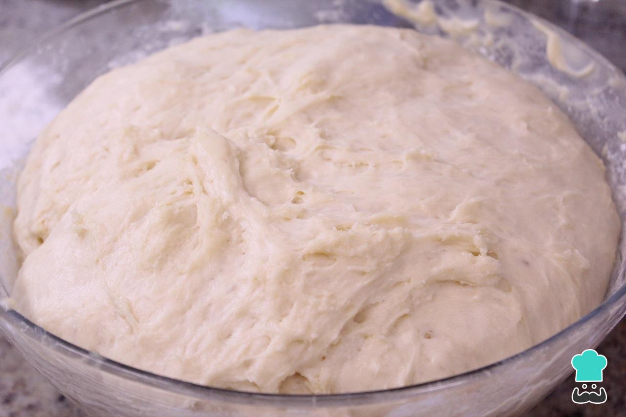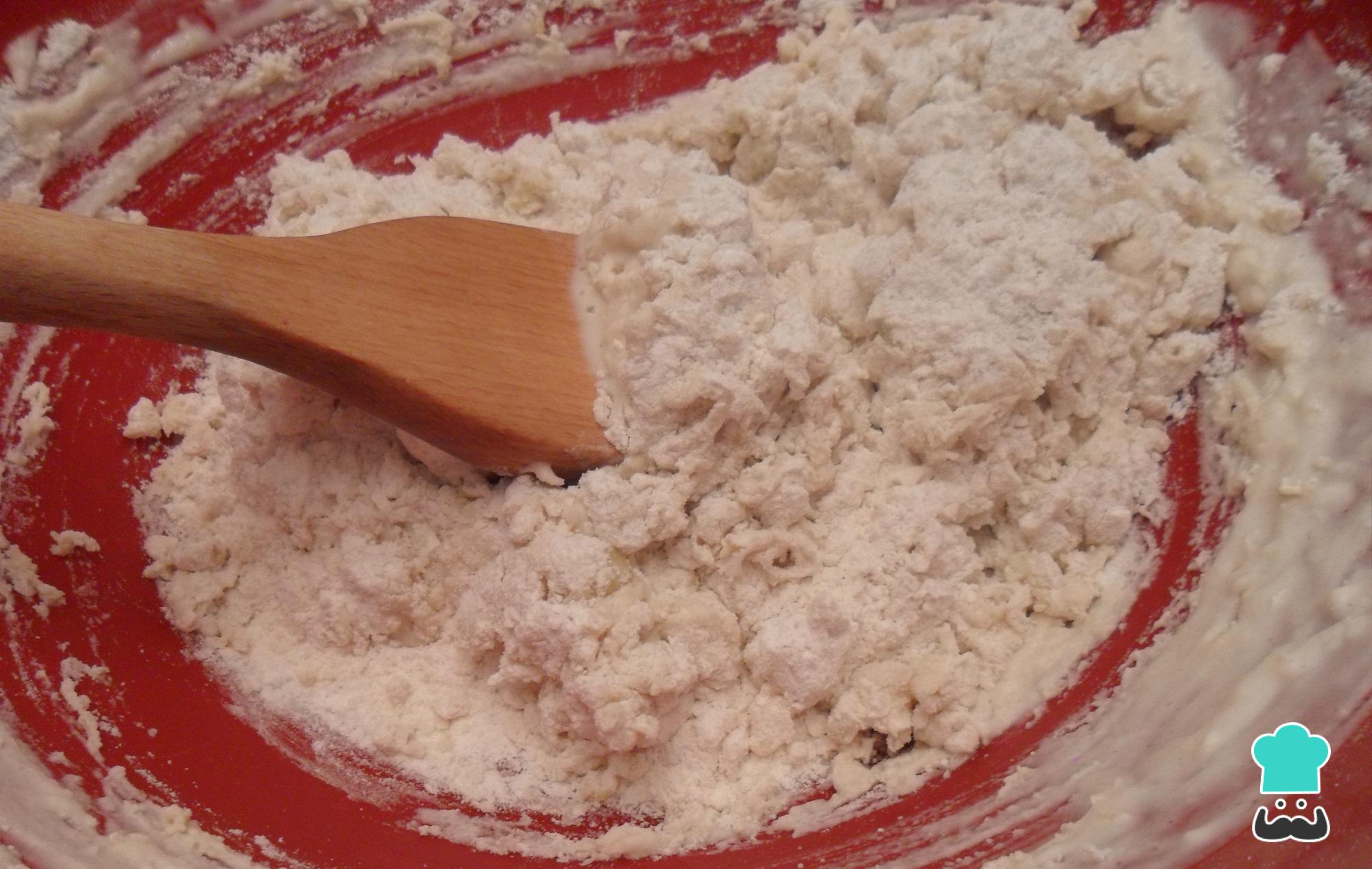 Após esse tempo adicione lentamente a restante água e restante farinha, enquanto mistura com uma mão. Misture bem e, quando começar desgrudando das mãos, transfira para uma superfície lisa e enfarinhada.