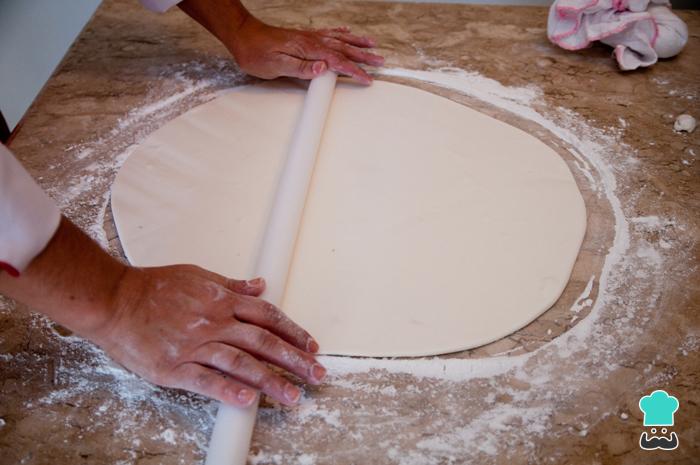 Quando passarem os 40 minutos, transfira a massa de novo para a superfície enfarinhada e abra formando um retângulo com cerca de 1 cm de espessura.