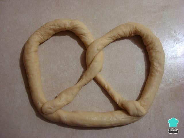 Corte tiras com aproximadamente 2 centímetros de largura, enrole e modele no formato de pretzel original, como na imagem.