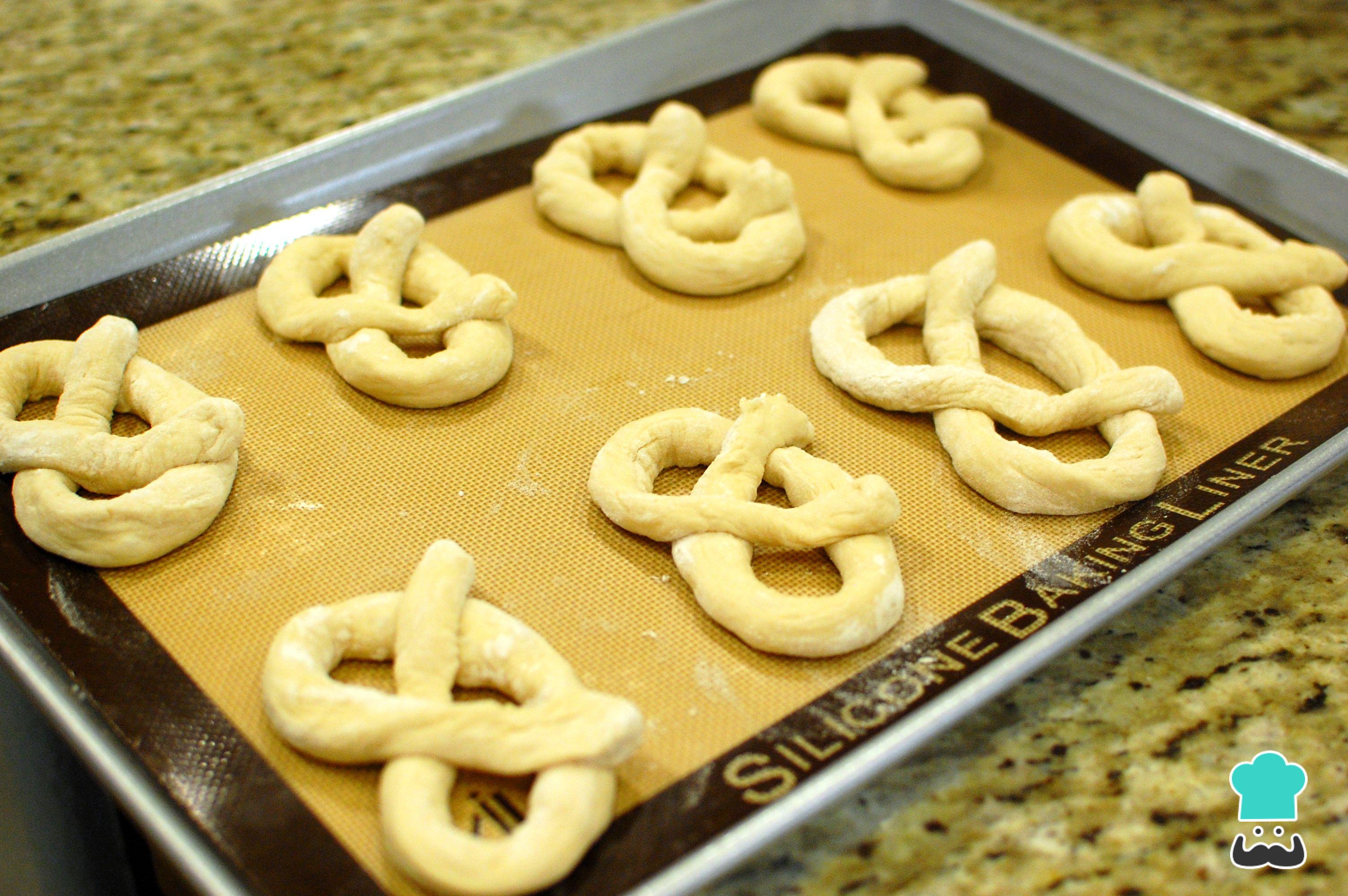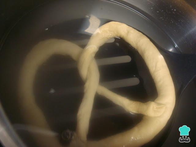 Dilua o bicarbonato de sódio em 1 litro de água. Mergulhe nela os pretzels, assim eles ficarão macios por dentro e crocantes por fora.
