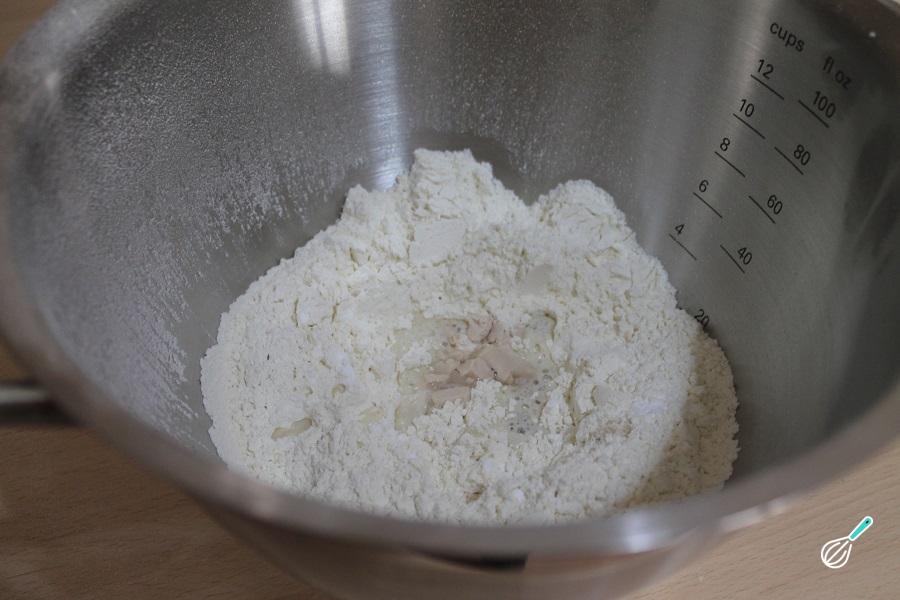 Após o tempo indicado peneire a farinha da massa para uma tigela e acrescente a água morna, o fermento biológico fresco, o açúcar e uma pitada de sal. Misture tudo muito bem com uma colher ou com as mãos.