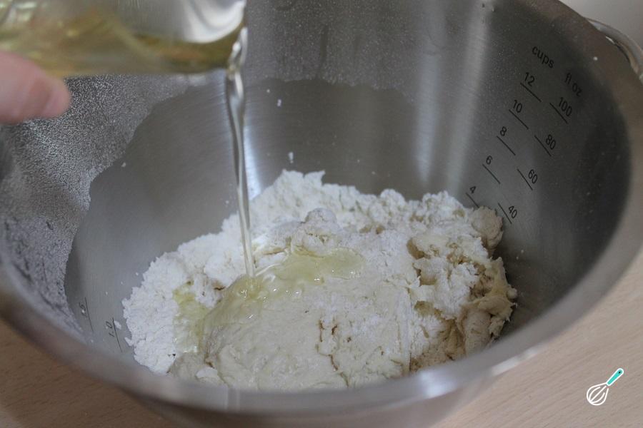 Acrescente o fermento natural preparado no primeiro passo e também o óleo de girassol. Misture muito bem e sove essa massa de pretzel até que fique lisa e desgrudando das mãos.