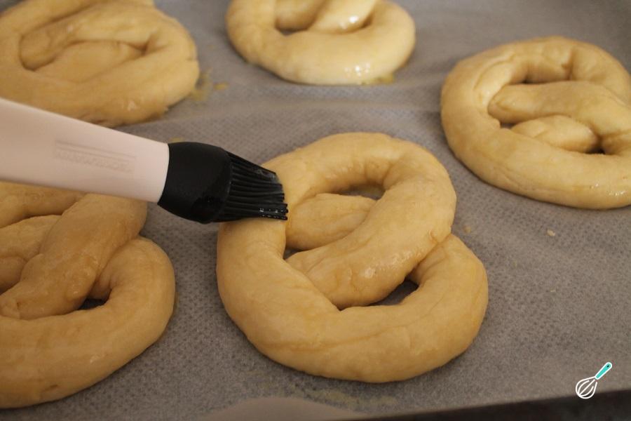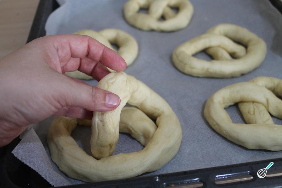 Após o tempo indicado chega o momento de modelar o pretzel! Separe a massa em 5 pedaços iguais e estique cada um deles em forma de charuto fino, até que fiquem com cerca de 40cm de comprimento. Depois cruze as pontas da massa e dobre como na fotografia. Coloque os pretzels em um tabuleiro de forno forrado com papel manteiga.