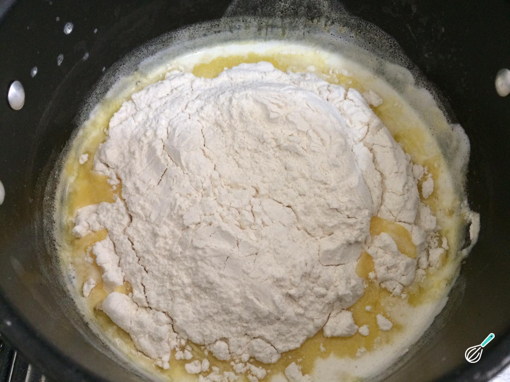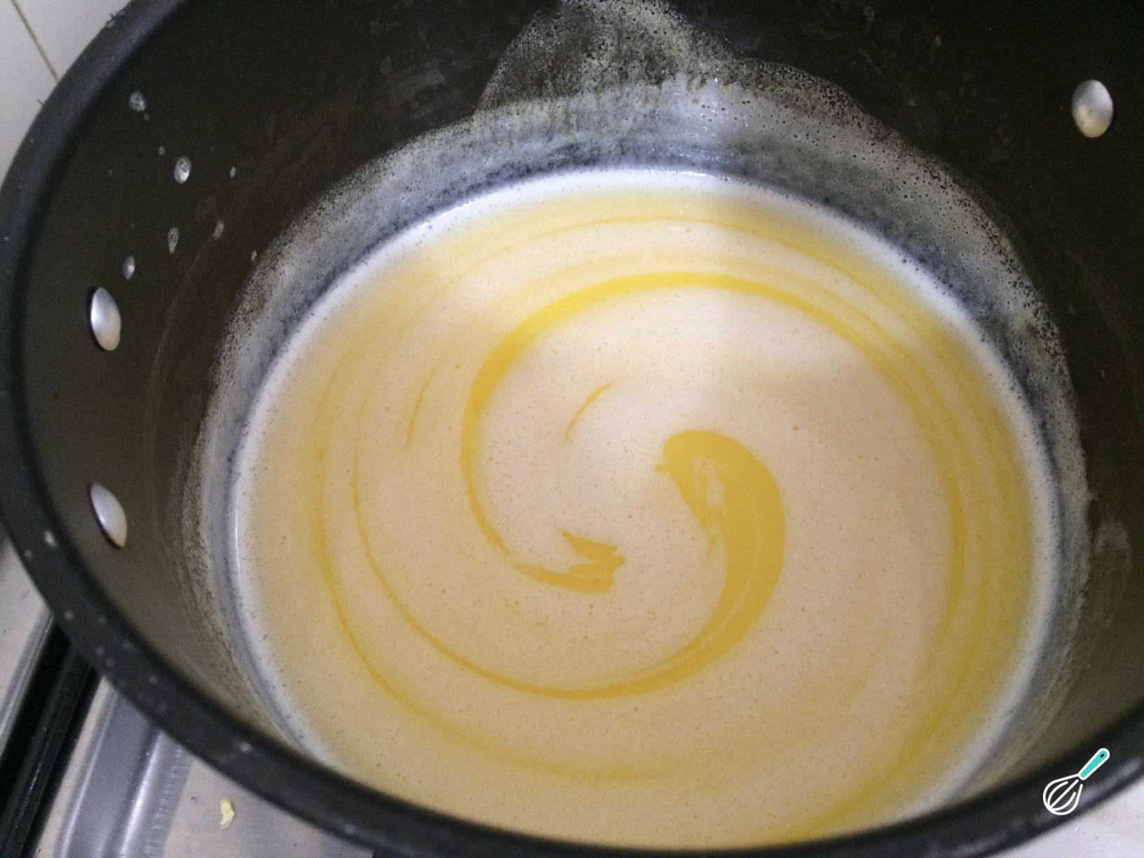 Para preparar a massa choux, numa panela adicione o leite, o açúcar e a manteiga. Cozinhe em lume baixo para derreter a manteiga e dissolver o açúcar completamente.