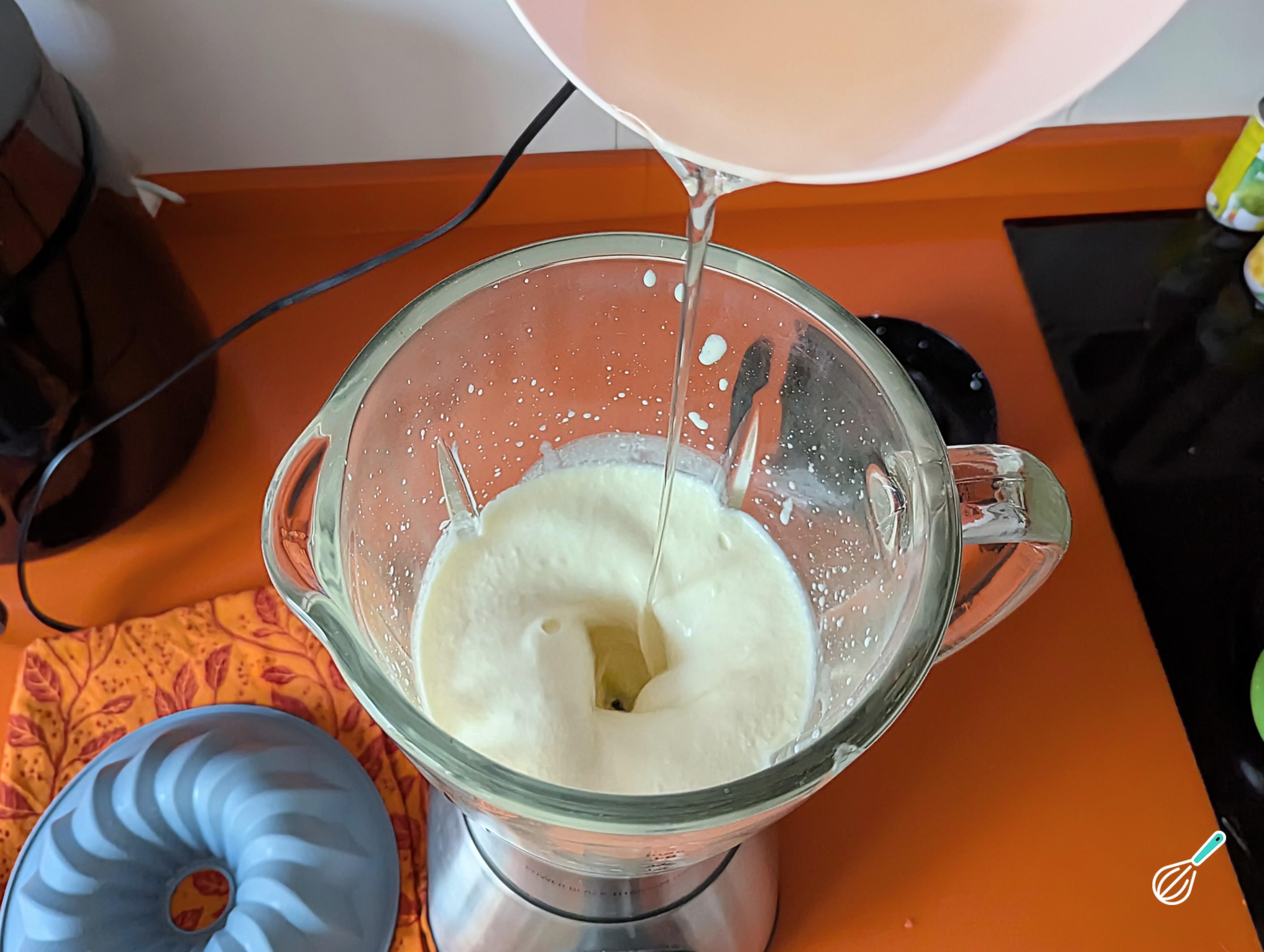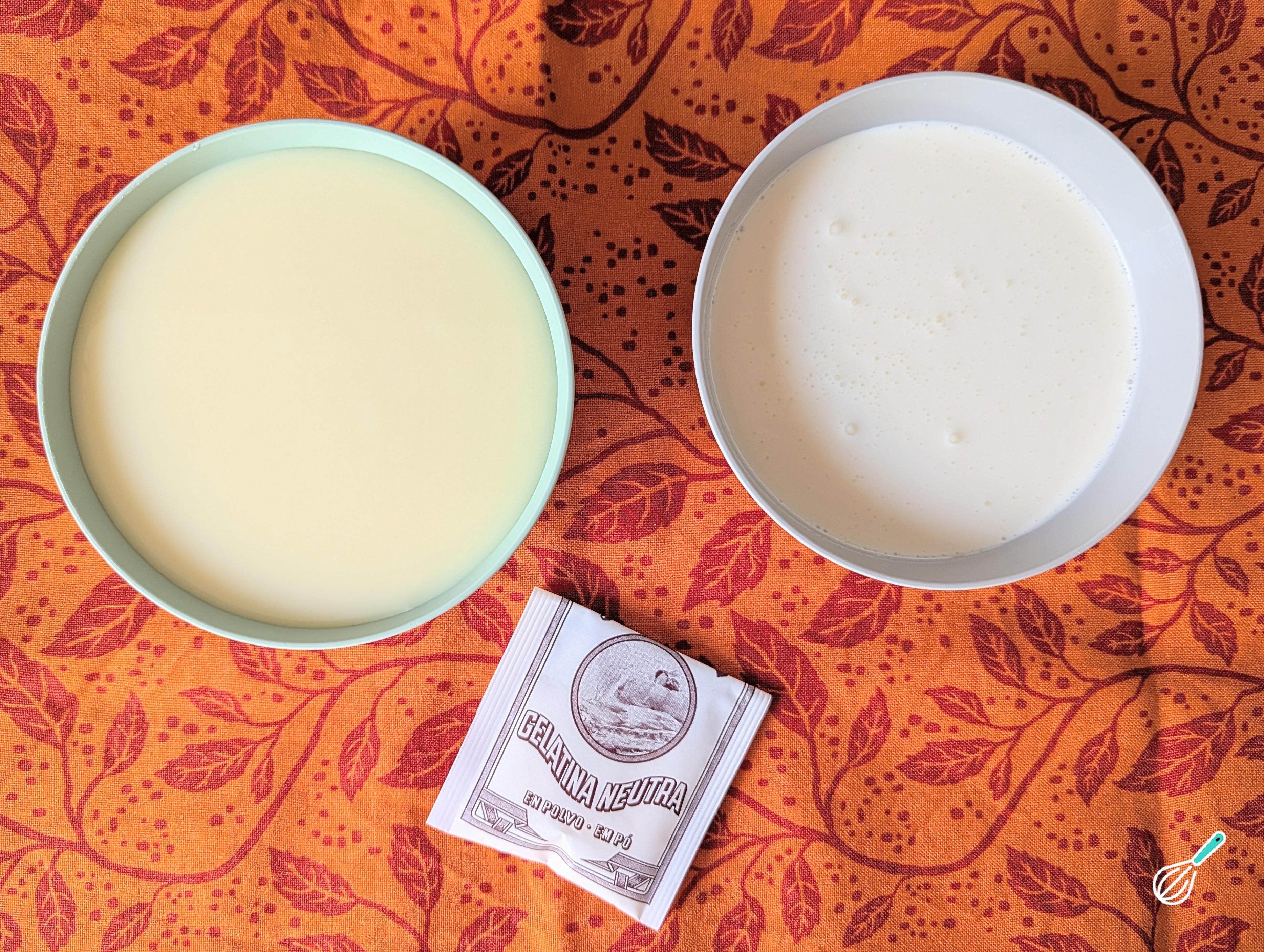 Com o liquidificador ainda ligado, acrescente aos poucos a gelatina dissolvida. Continue batendo por mais 1 minuto para que a mistura fique bem incorporada.