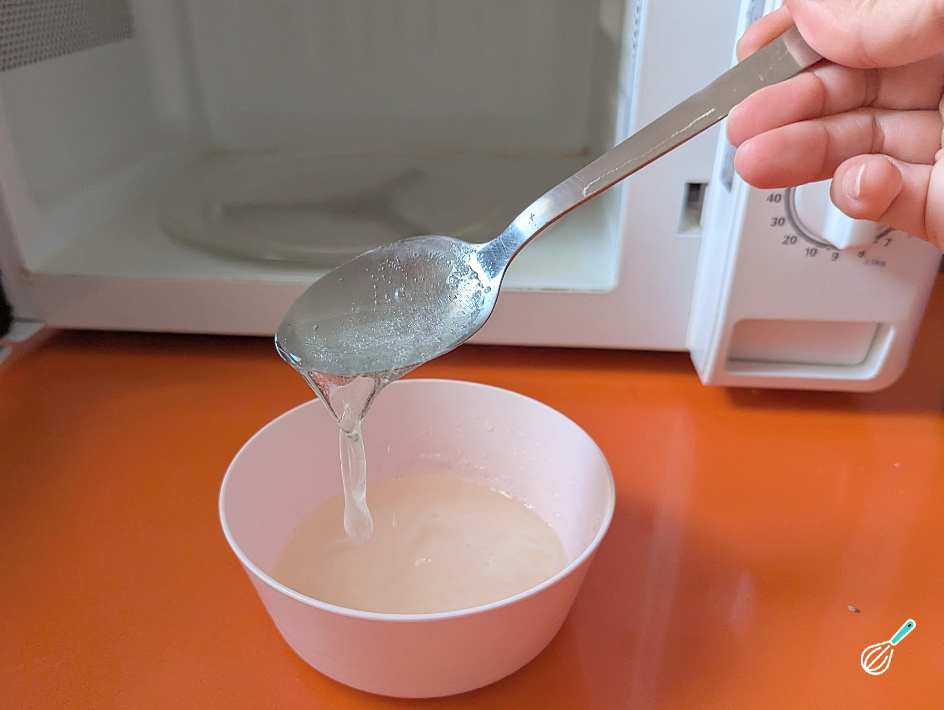 Aqueça no micro-ondas por volta de 15 segundos ou em banho-maria, mexendo até dissolver completamente. Reserve.