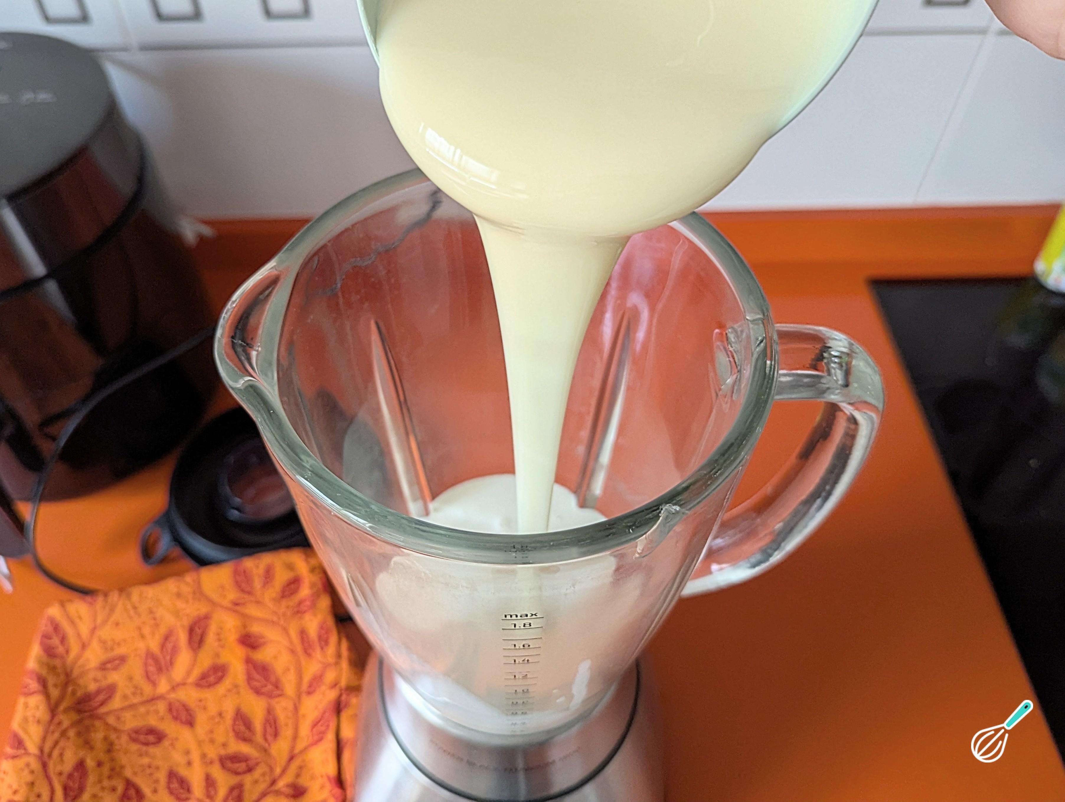 No liquidificador, adicione o leite condensado e o creme de leite. Bata por aproximadamente 2 minutos até formar um creme homogêneo.