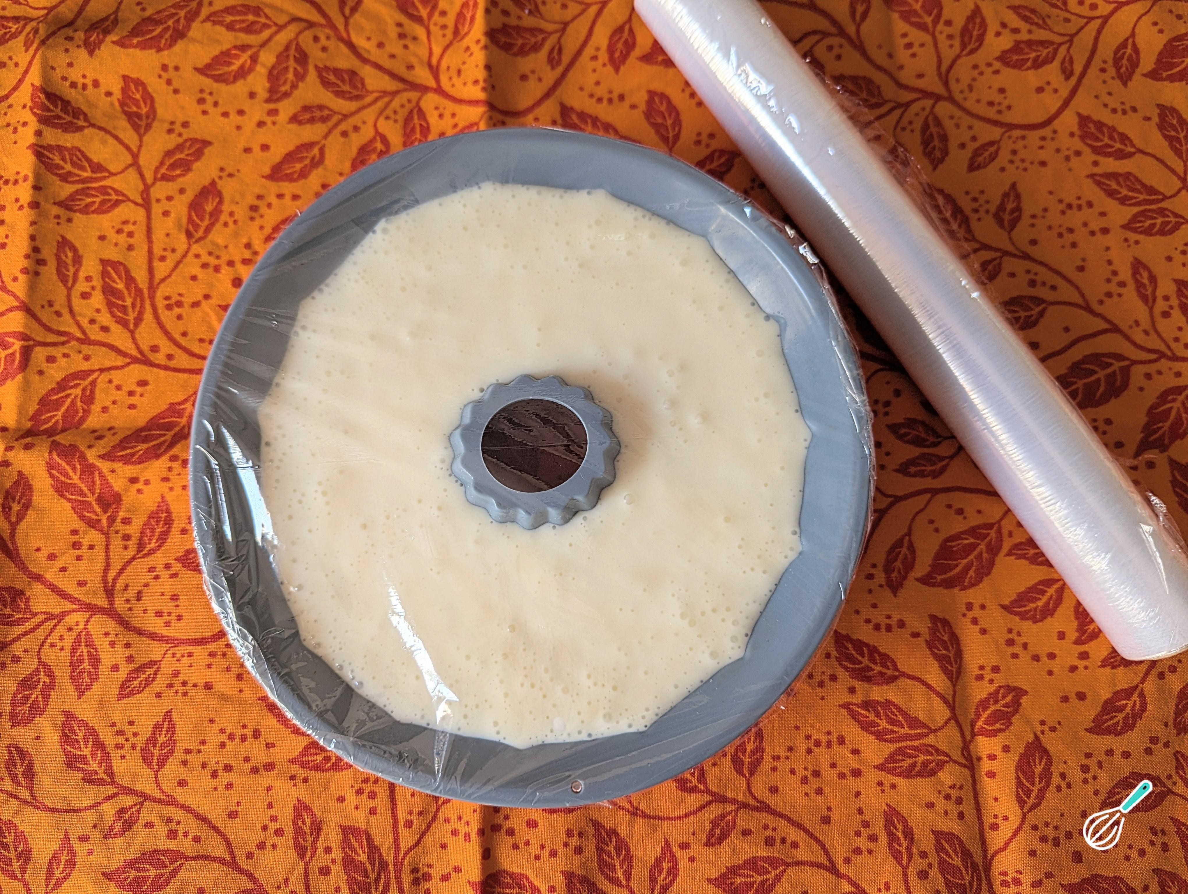 Cubra com plástico filme e leve a geladeira por pelo menos 4 horas, ou até que o pudim esteja firme.