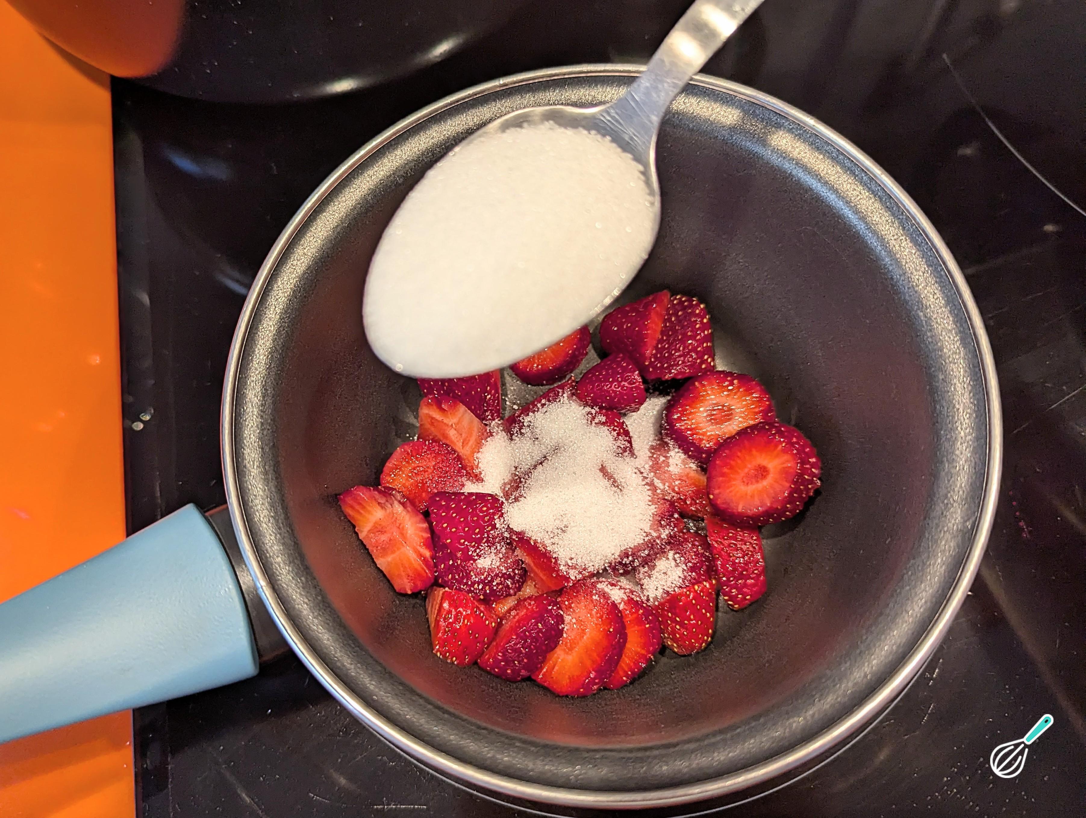 Se você optar por deixar seu pudim ainda mais saboroso, faça uma calda de morangos. Em uma panela pequena, coloque os morangos (já higienizados e picados), o açúcar e a água.
