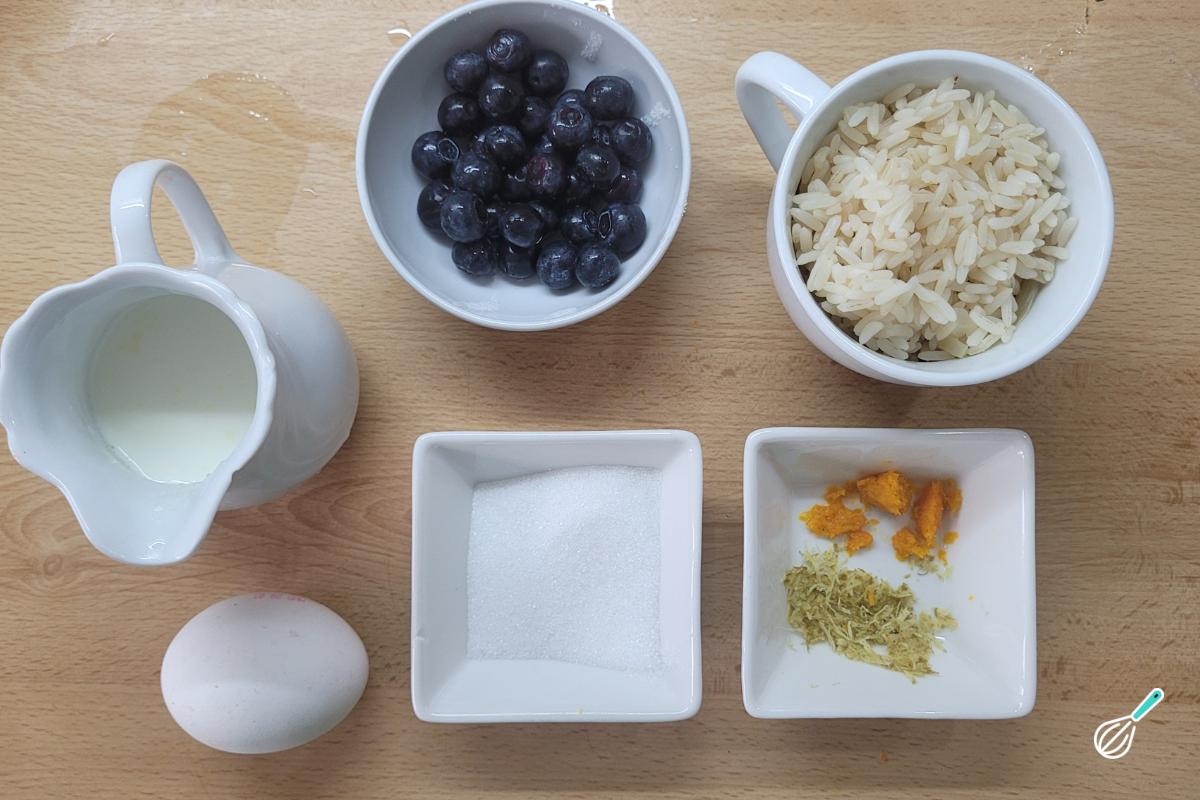 Separe os ingredientes para fazer seu pudim de arroz. Aqui usei mirtilos para misturar na massa e deixar essa receita ainda mais especial, mas você pode fazer apenas a massa base. Outra opção no lugar dos mirtilos é usar cerejas - em calda ou in natura.
