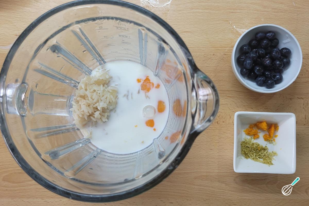 No liquidificador, coloque o ovo, o leite, o arroz cozido e o açúcar. Os mirtilos serão misturado inteiros à massa - esse é o toque especial dessa receita, pois ao assarem eles irão dar uma leve derretida e criar bolsinhas que derretem na boca. Também gosto de adicionar as raspas de limão e laranja apenas depois de bater para evitar que amarguem.