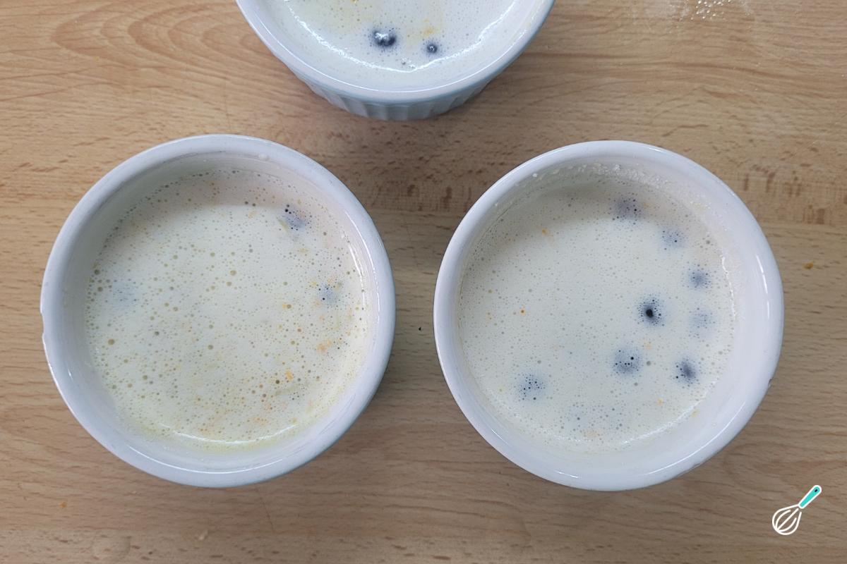 Quando a massa estiver homogênea, misture os mirtilos e as raspas de limão e laranja e verta sobre a forma. Aqui, fiz porções individuais e por isso usei esses ramequins untados com manteiga e polvilhados com um pouquinho de açúcar para facilitar na hora de desenformar. Você pode aumentar a quantidade para assar em uma forma tradicional de pudim com um furo no meio e se preferir, pode fazer a calda de açúcar antes de verter a massa.