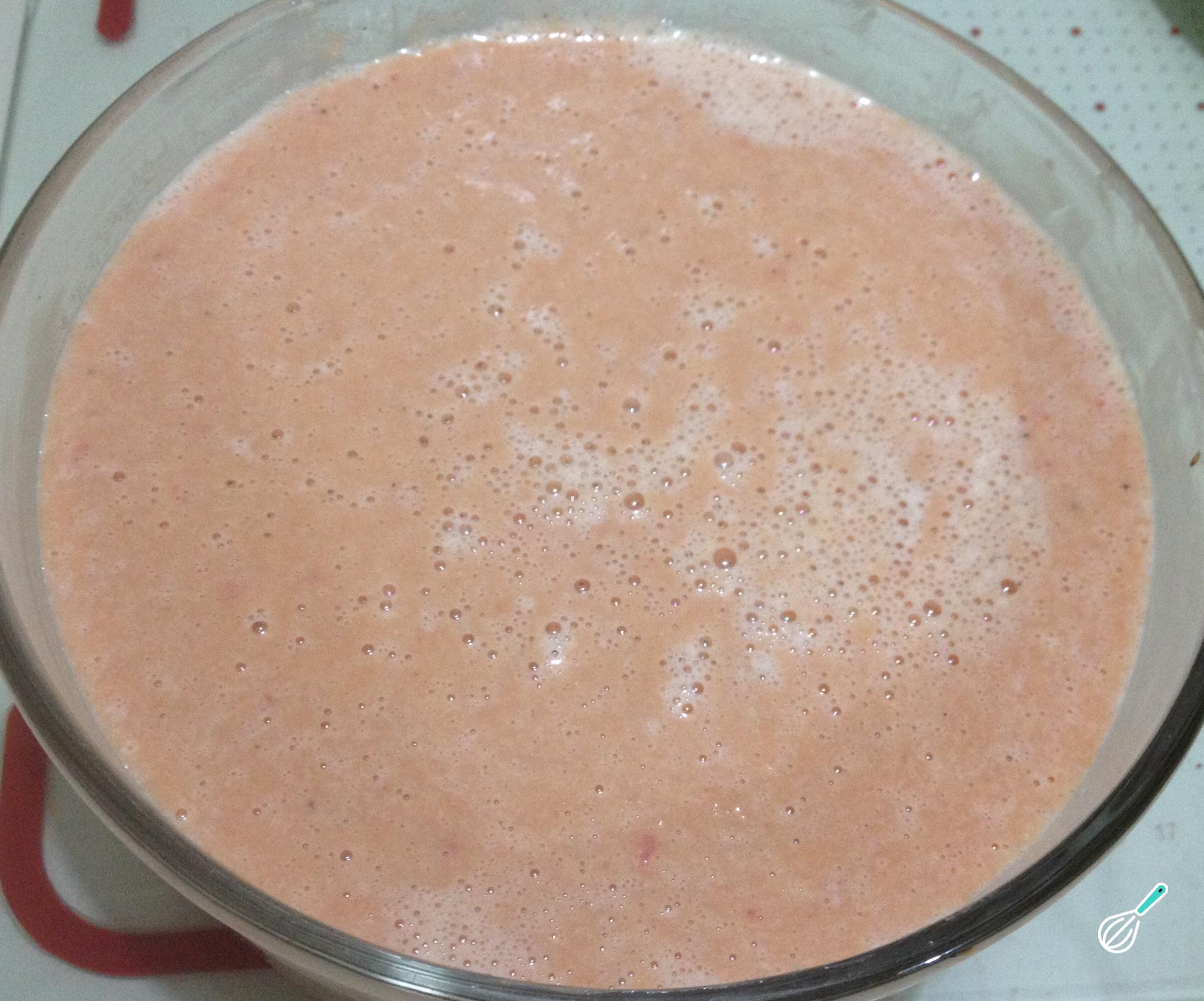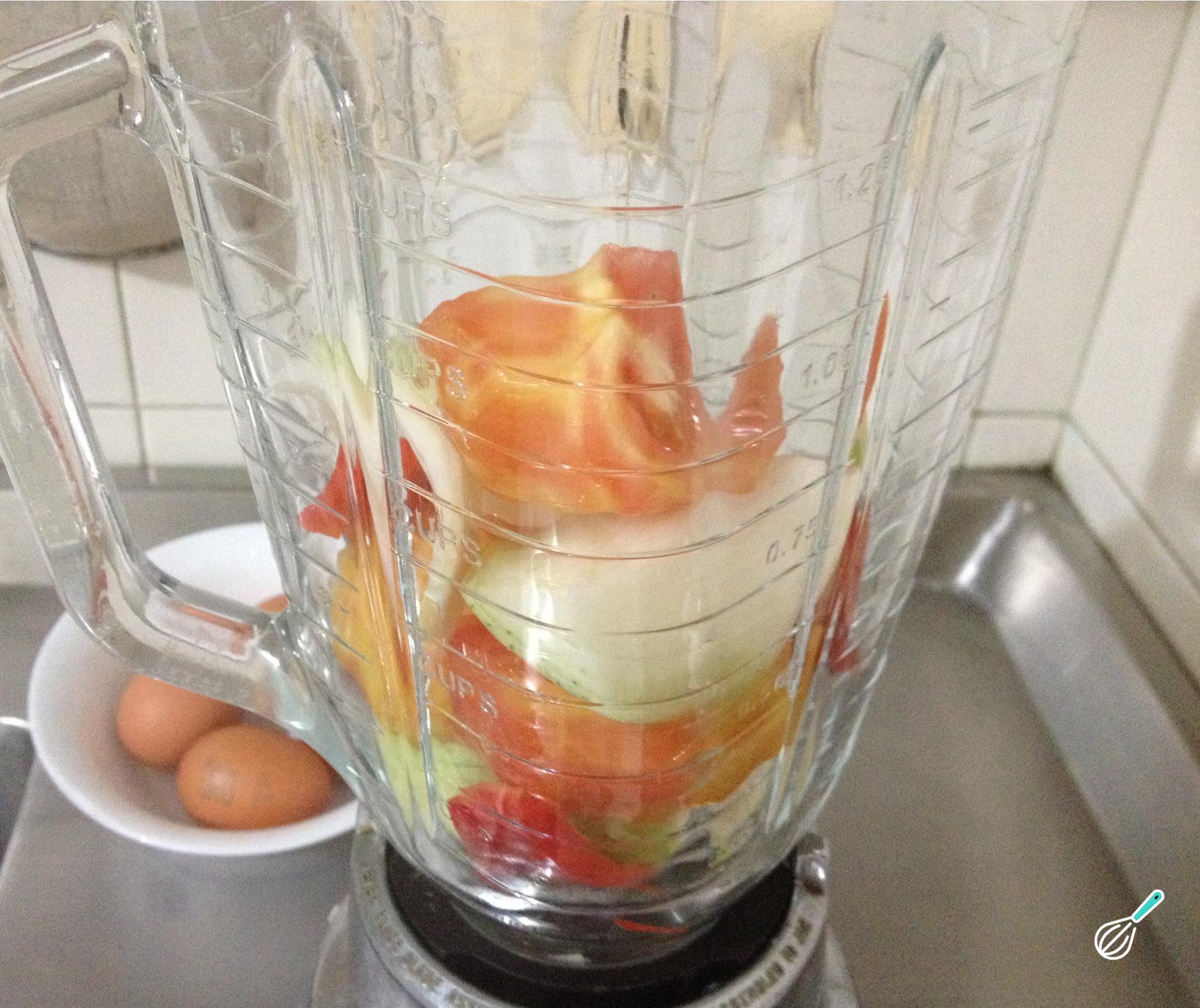 Corte os vegetais em pedaços (retire a pele e sementes do tomate) e coloque no liquidificador com dois ovos. Bata muito bem.