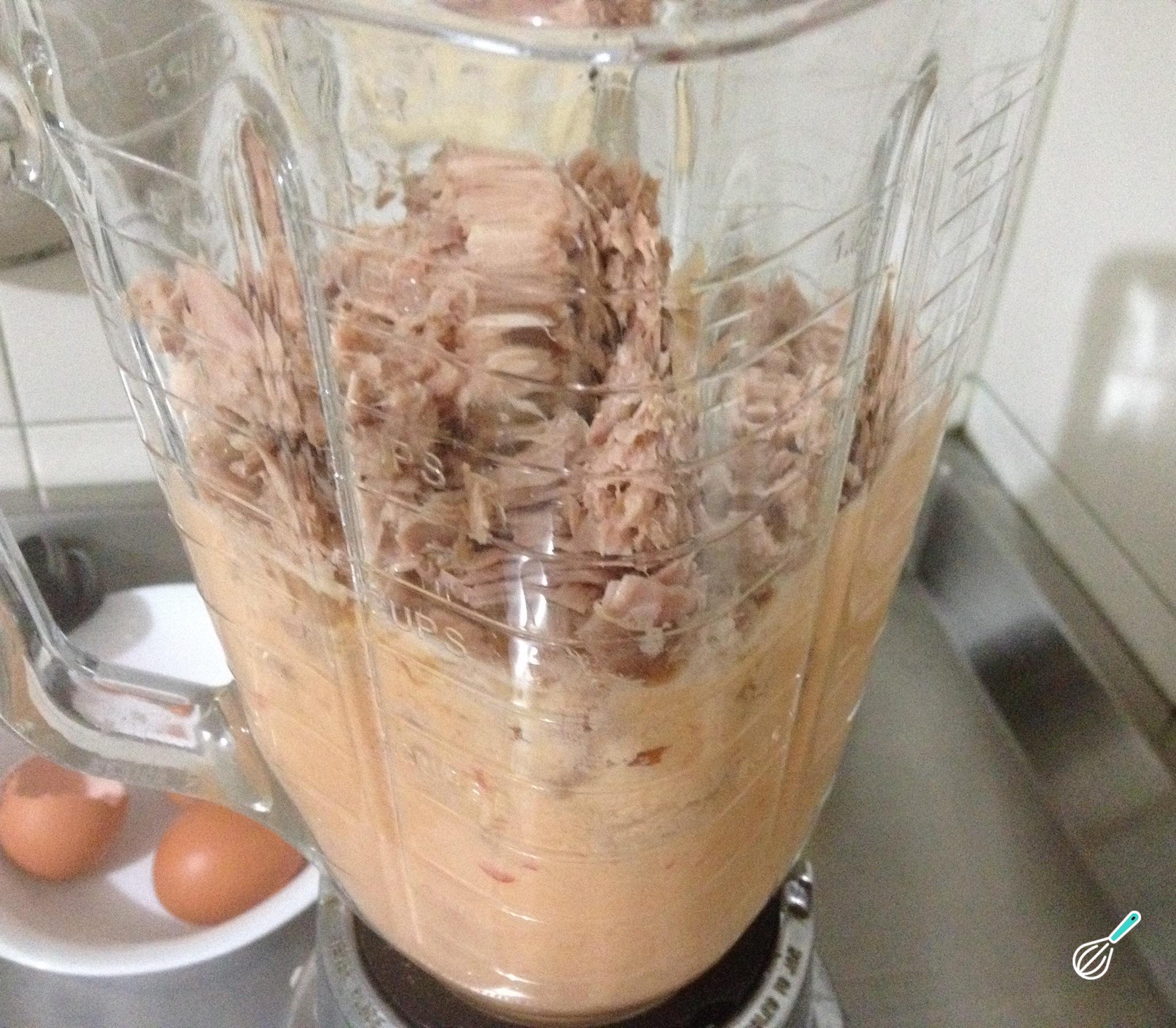 Acrescente o atum, os dois ovos restantes, sal e pimenta. Misture até obter uma mistura homogênea.