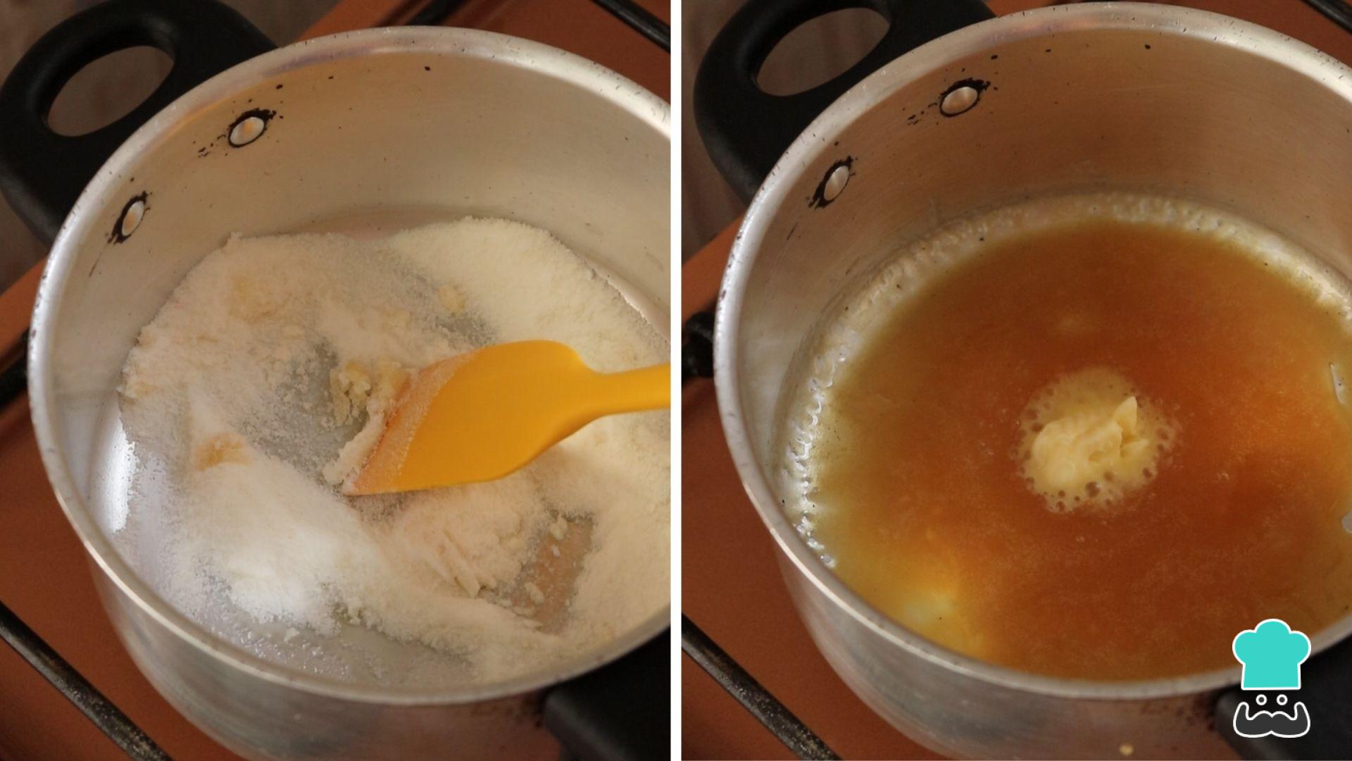 Para preparar o calda, leve uma panela ao fogo baixo e derreta o açúcar até formar caramelo dourado. Quando chegar nesse tom, adicione a manteiga e mexa bem.